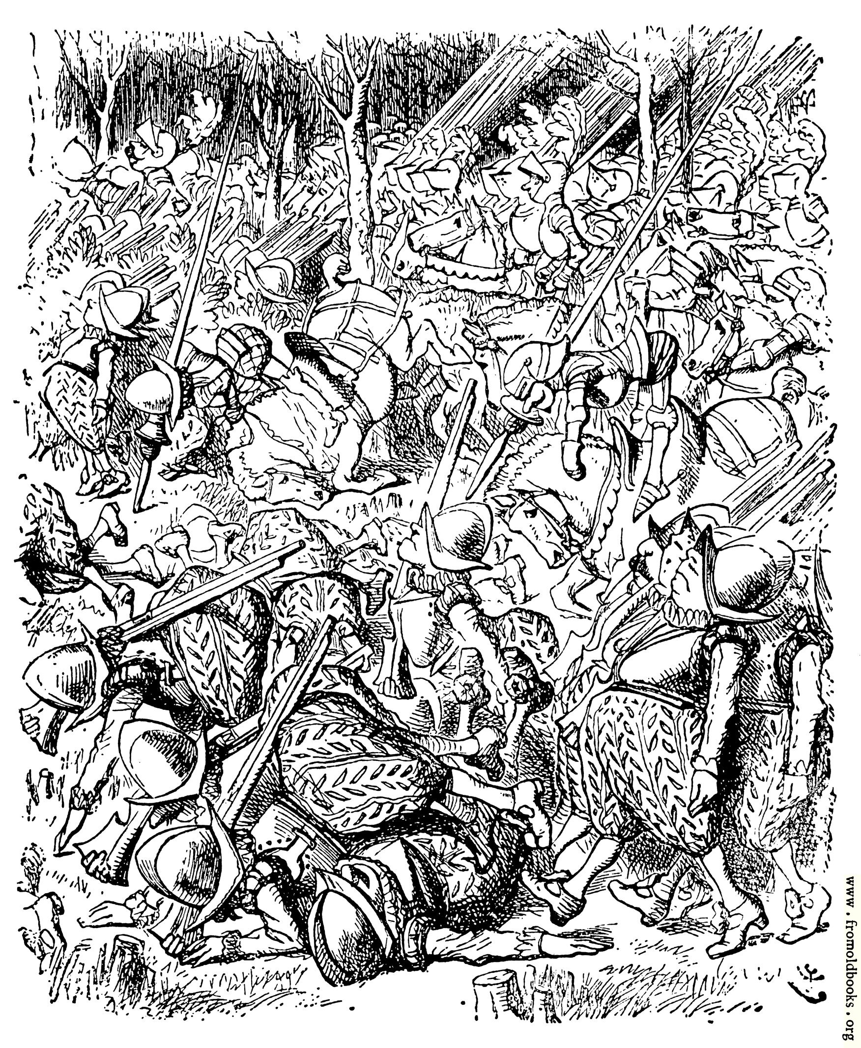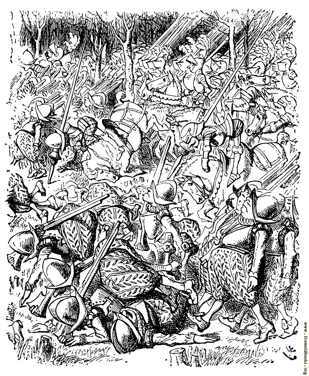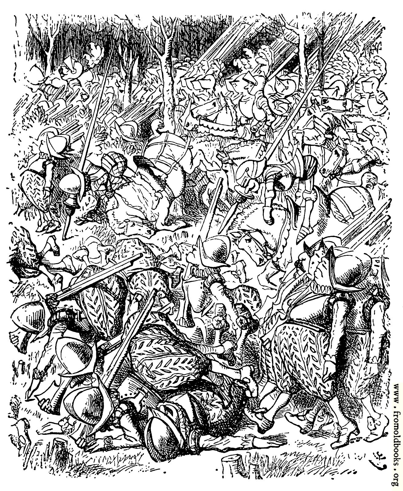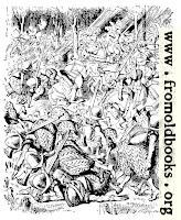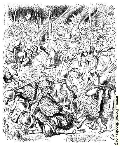 The next moment soldiers came running through the wood, at first in twos and threes, then ten or twenty together, and at last in such crowds that they seemed to fill the whole forest. Alice got behind a tree, for fear of being run over, and watched them go by.