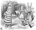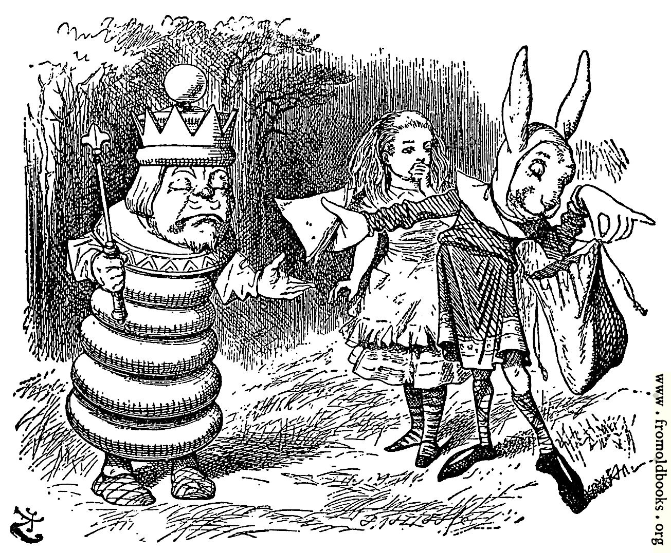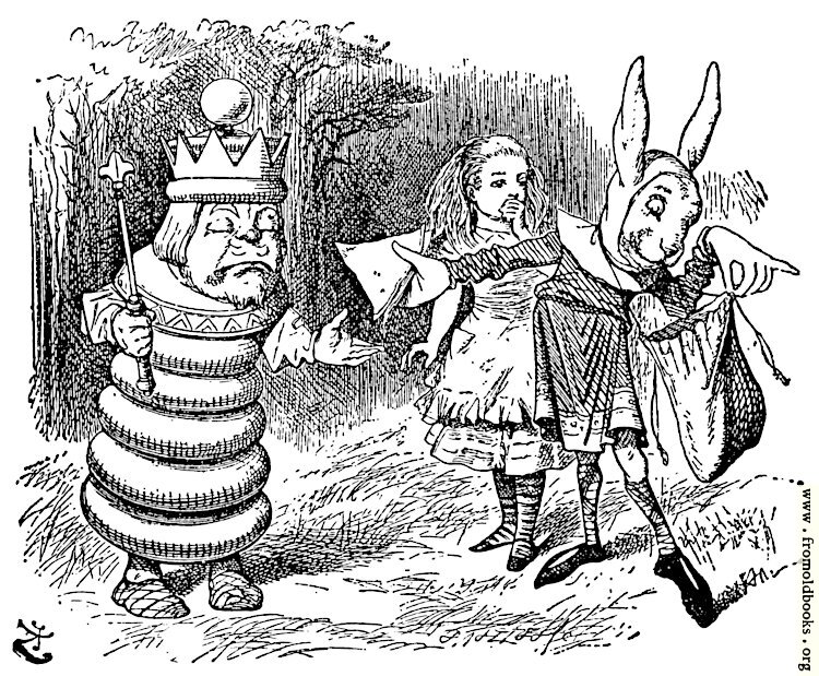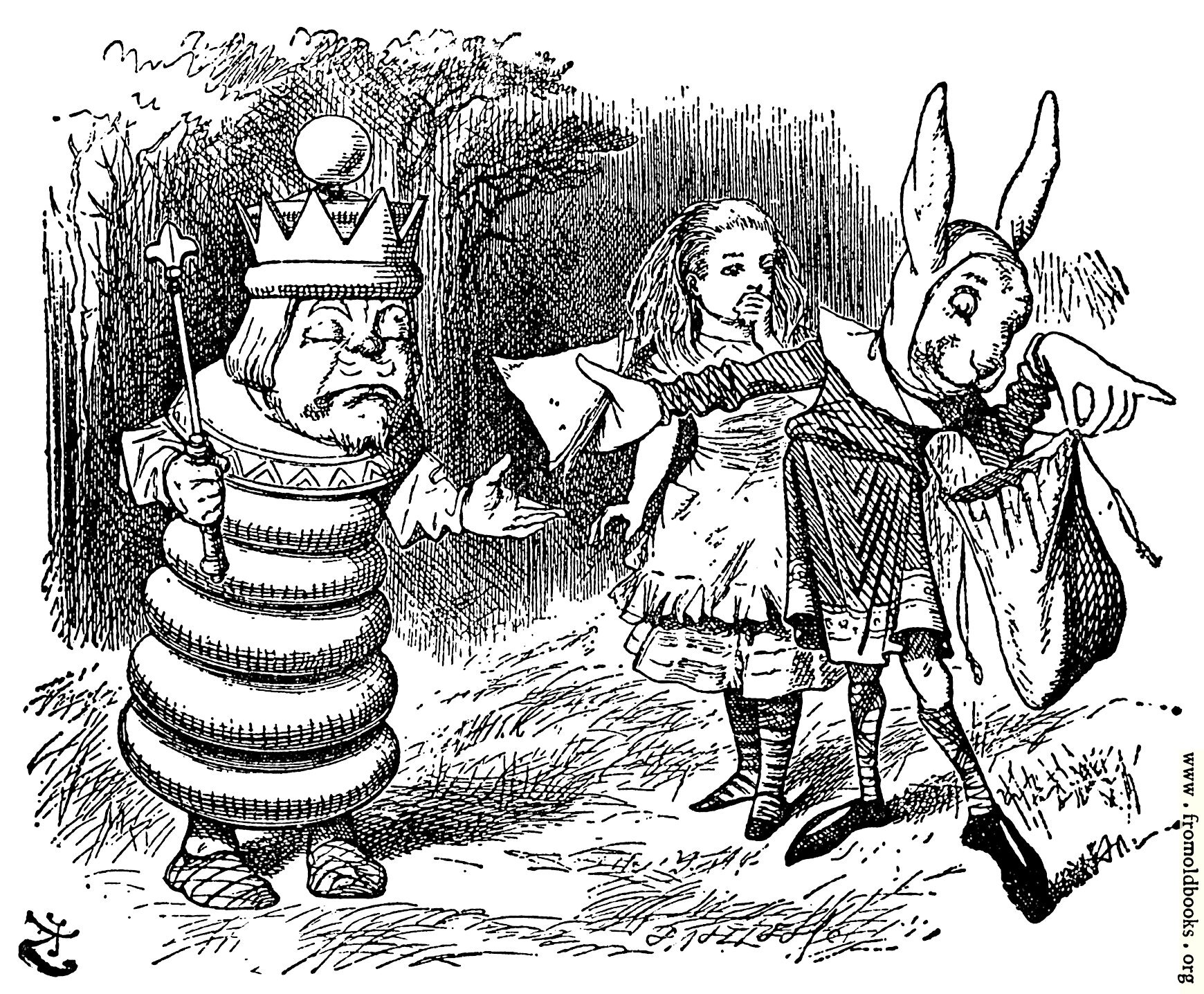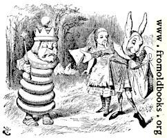 The White King demands that the rabbit messenger gives him something to eat, while Alice looks on from a safe distance.