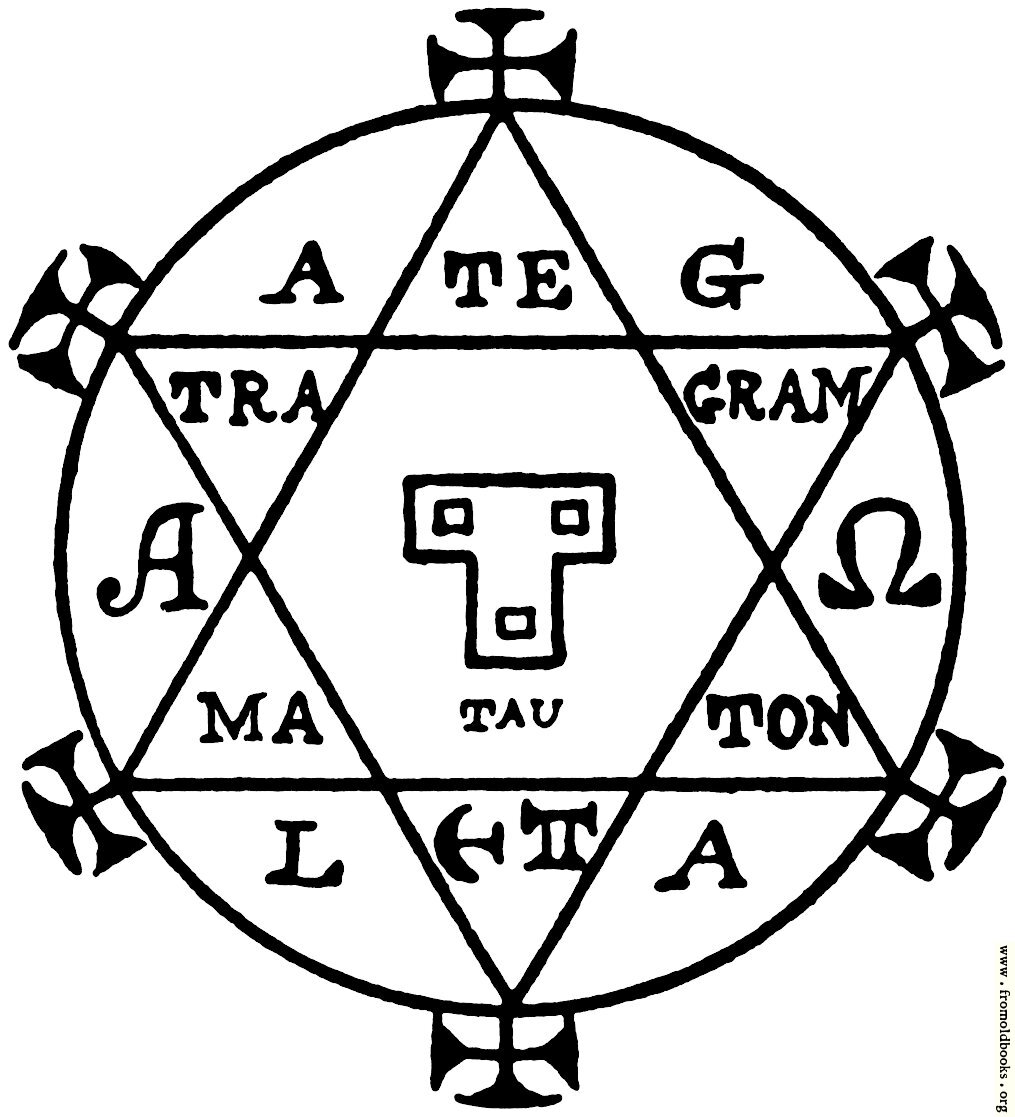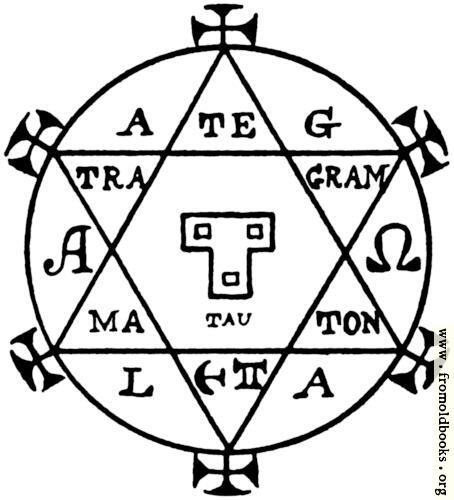 (Colours.—Circle, Hexagon, and T cross in centre outlined in black, Maltese crosses black; the five exterior triangles of the Hexagram where Te, tra, gram, ma, ton, is written, are filled in with bright yellow; the T cross in centre is red, with the three little squares therein in black. The lower exterior triangle, where the Sigil is drawn in black [1], is left white. The words “Tetragrammaton” and “Tau” are in black letters; and AGLA with Alpha and Omega in red letters.)