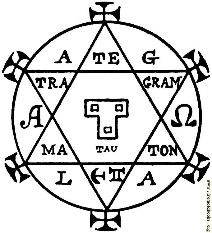 In the centre is a Greek letter tau, but here drawn more as a beheaded cross, with squares for nails for hands and feet, and the word “TAU” beneath it.