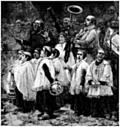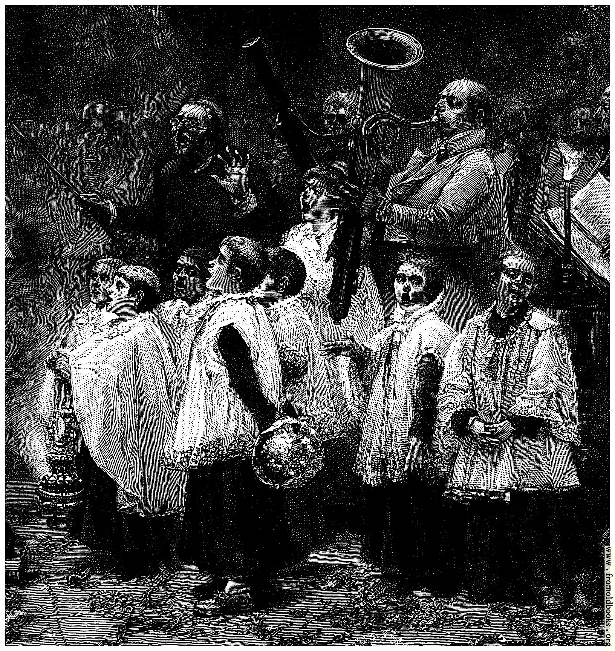 In a dark candle-lit church, a bespectacled man holding a baton is leading a choir of boys in white surplices. The boys are not actually looking at the conductor, and are perhaps drowned out by the bassoon and the tuba in their midst. The front boy (on our left) holds a thurible, or censer, suggesting that this is either a Roman Catholic or high church Protestant service. The boy nearest to us holds what might be a hat. We can dimly make out faces behind the choir.