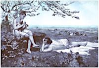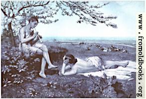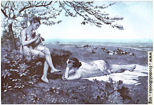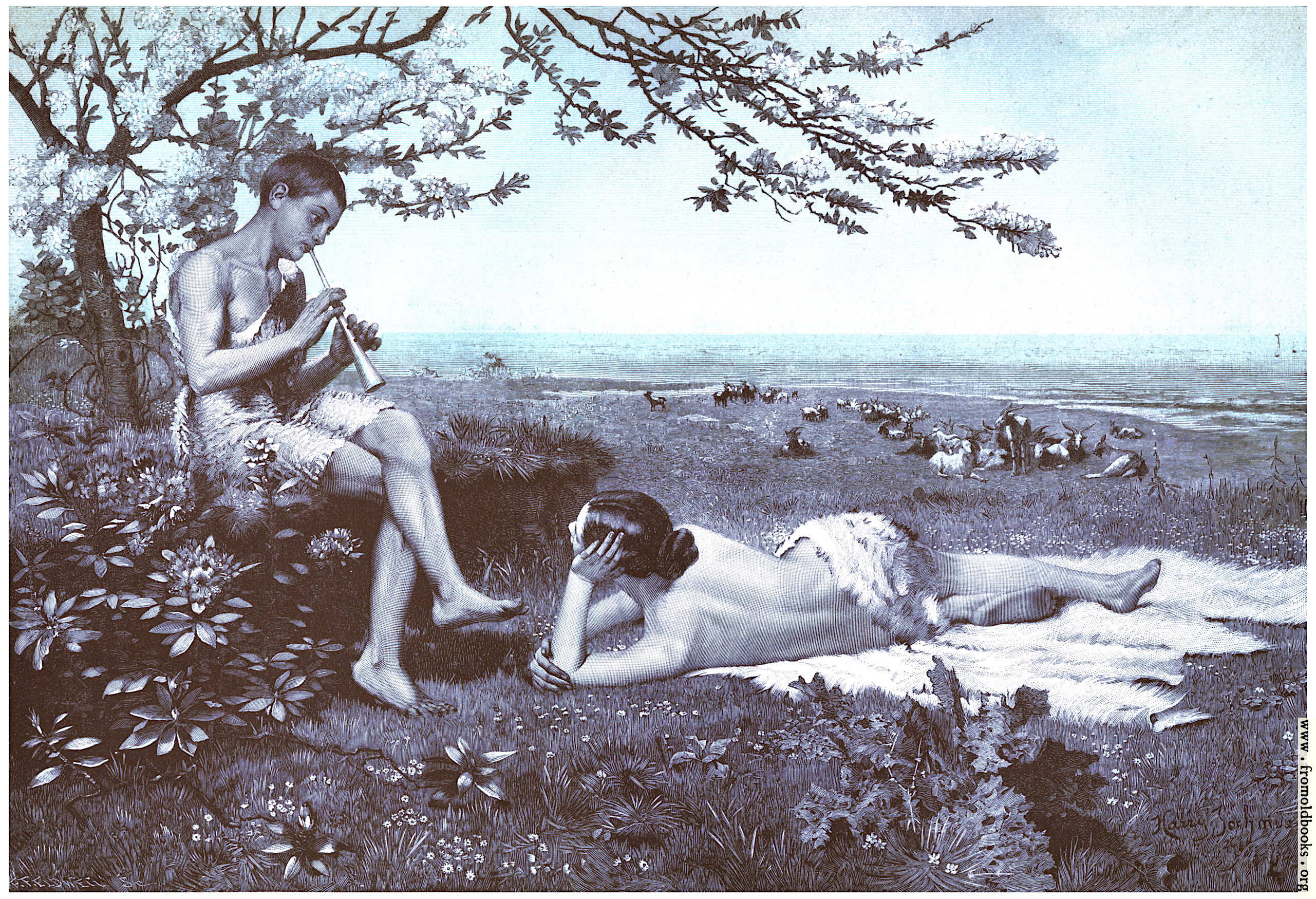 A young man, rather scantily clad in an animal skin draped over one shoulder and over his crotch, plays the flute to a young woman lying on animal skins or fabric on the grass and gazing up at the boy. Behind the youth, a tree is in flower.