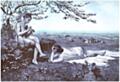 This engraving by F. Feldweg is based on a painting by the German artist Harry Jochmus (1855 – 1915). There appear to be several versions of the oil painting, with the boy being naked or partly clothed, and with water in the background or not, and the grazing animals in the distant in different positions.