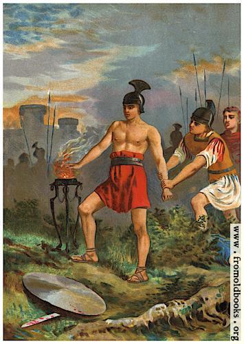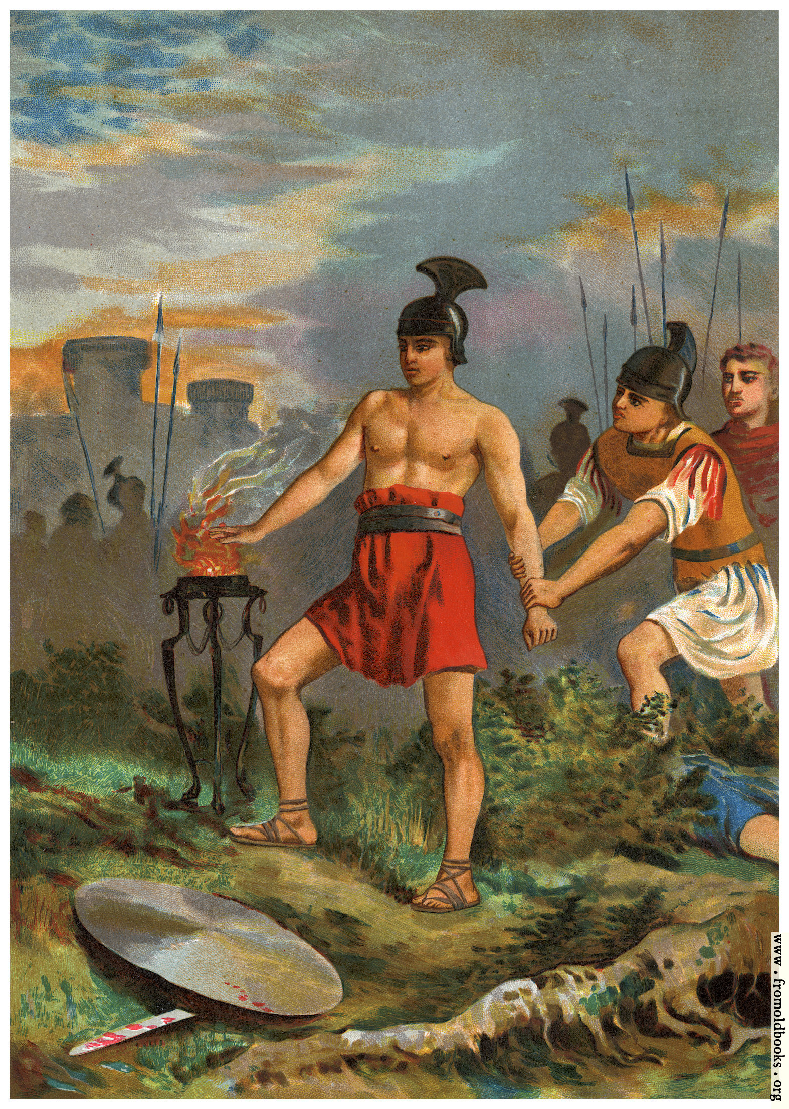 In this chromolithograph, a young man with a belt holding up his red breech-cloth or shorts, sandals, and the helmet of a warrior from Roman times, stands shirtless with his bare right arm extended over a hot and flaming brazier. Another soldier behind him tried to pull him away, but he is determined.
