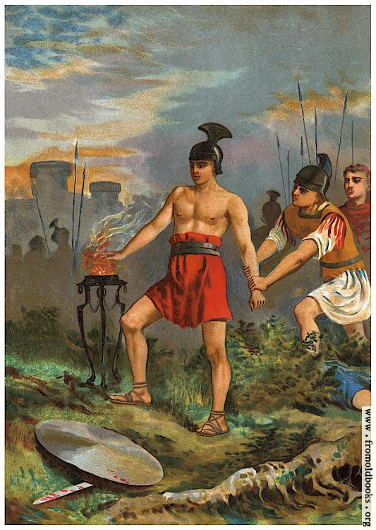 [Picture: M. Scevola se abrasa voluntariamenta la mano.]