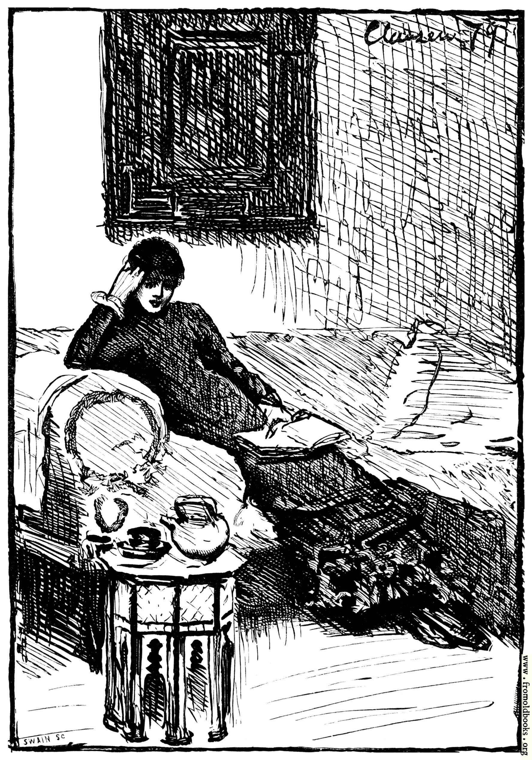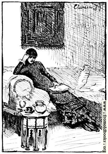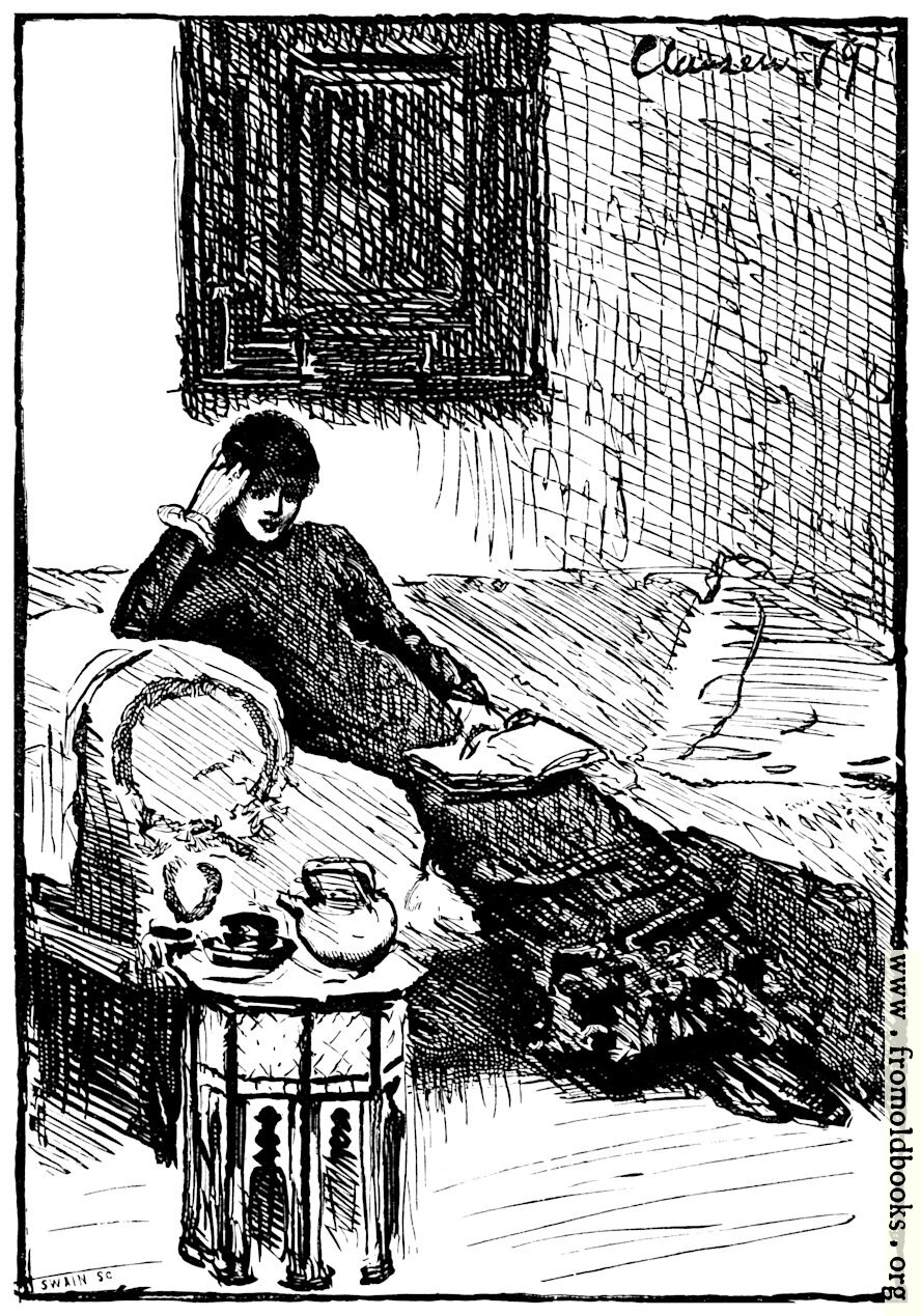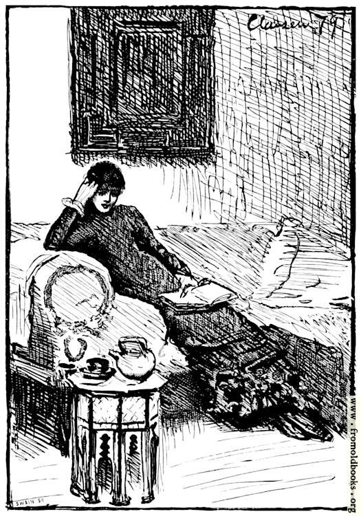A young lady languishes on a couch, one hand supporting her head, the other holding on her lap an open book She wears a dark full-length dress and black boots and sits on a couch with an oversized arm, with a pot of tea nearby on an octagonal occasional table imported from India or Morocco.