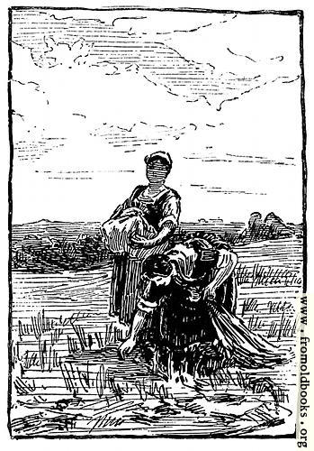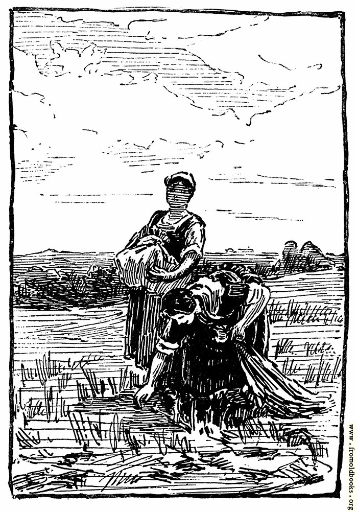 Gleaning means going into fields after the harvest and finding left-overs missed by the harvesters. When I was a child, in England, we had “gleaning rights” in a neighbouring field, and could go and collect wheat. This picture, then, shows two women picking up fallen ears of wheat (the main cereal crop in England) from the ground.