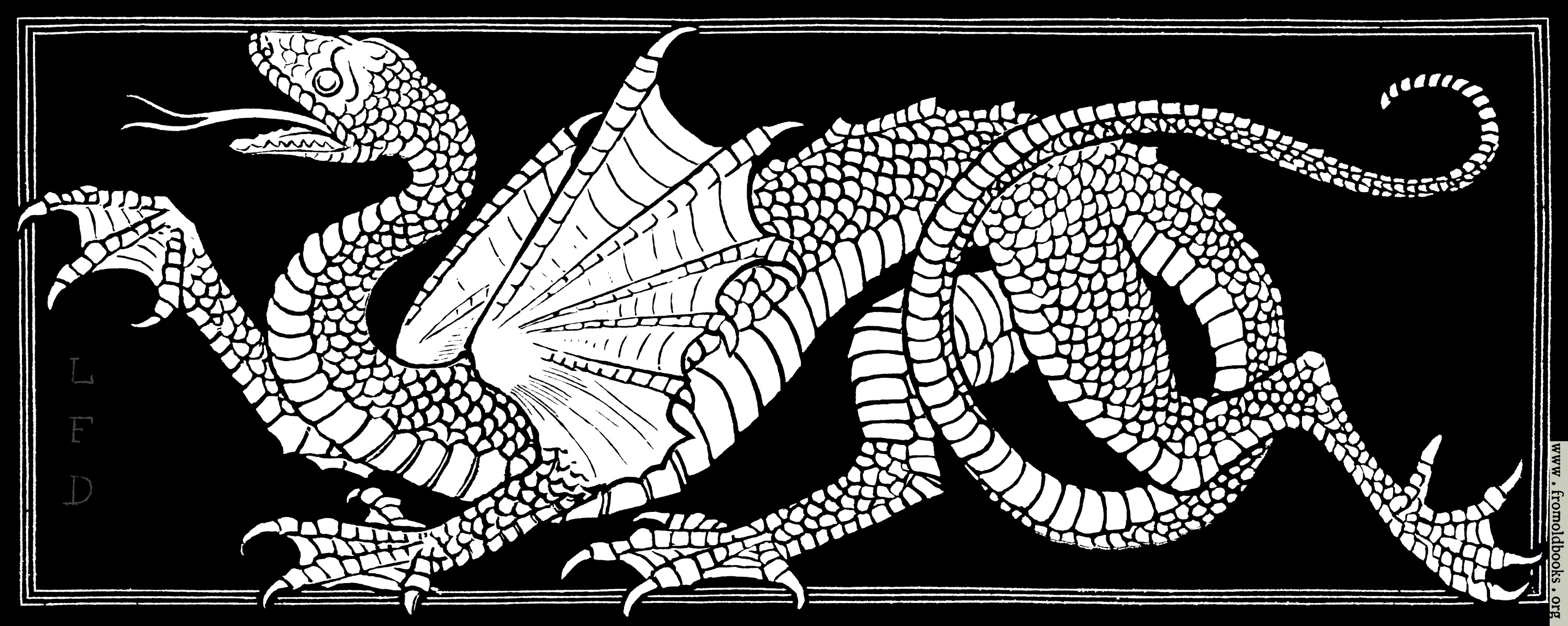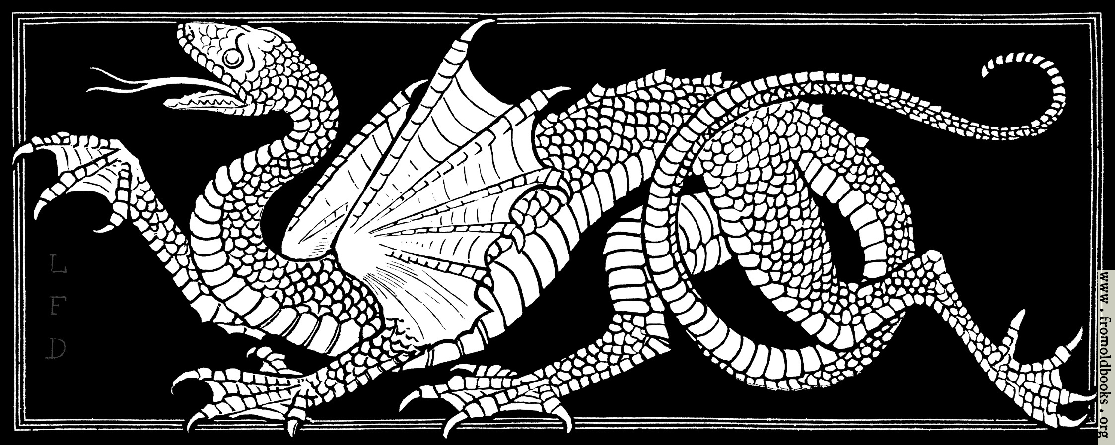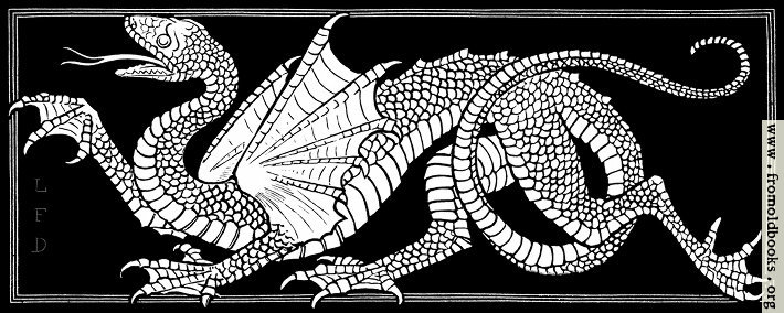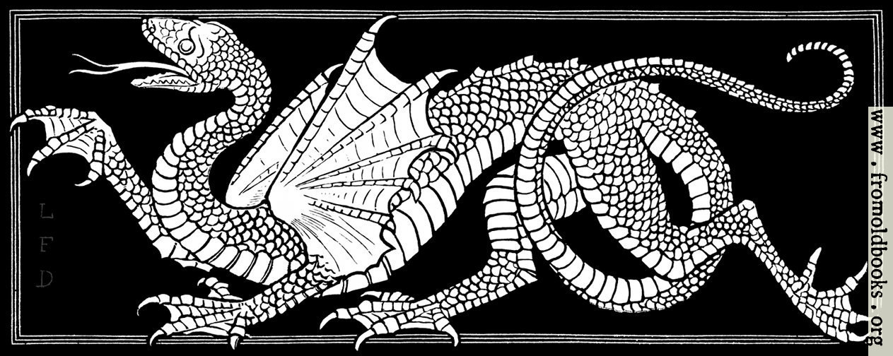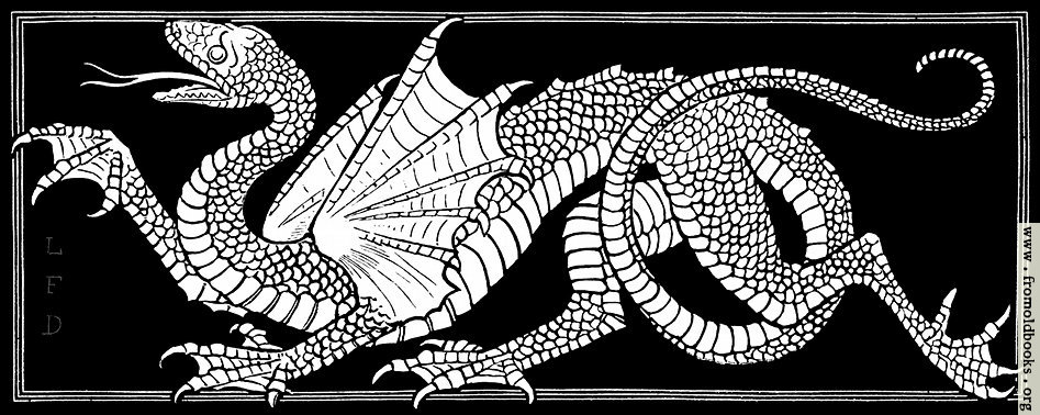 This engraving (probably a woodcut) of a dragon appears at the start of an article on dragons in ornament. It is marked L. F. D., presumably for Lewis F. Day, the author of the piece; and, since he died in 1910, more than 70 years ago, the image and text are out of copyright.