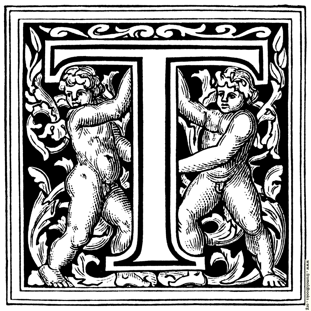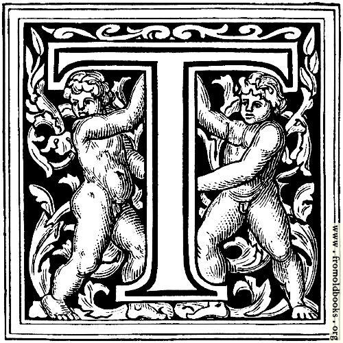 An initial letter “T” used as a drop cap in the magazine; the letter is supported by two naked people wity styized wings; they have genitals but are clearly intended to be infants. There is also a floral (floriated) border around part of the T, which has an inline border.
