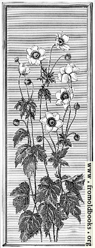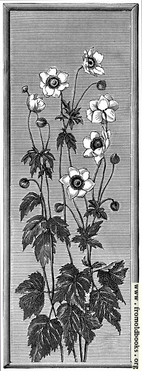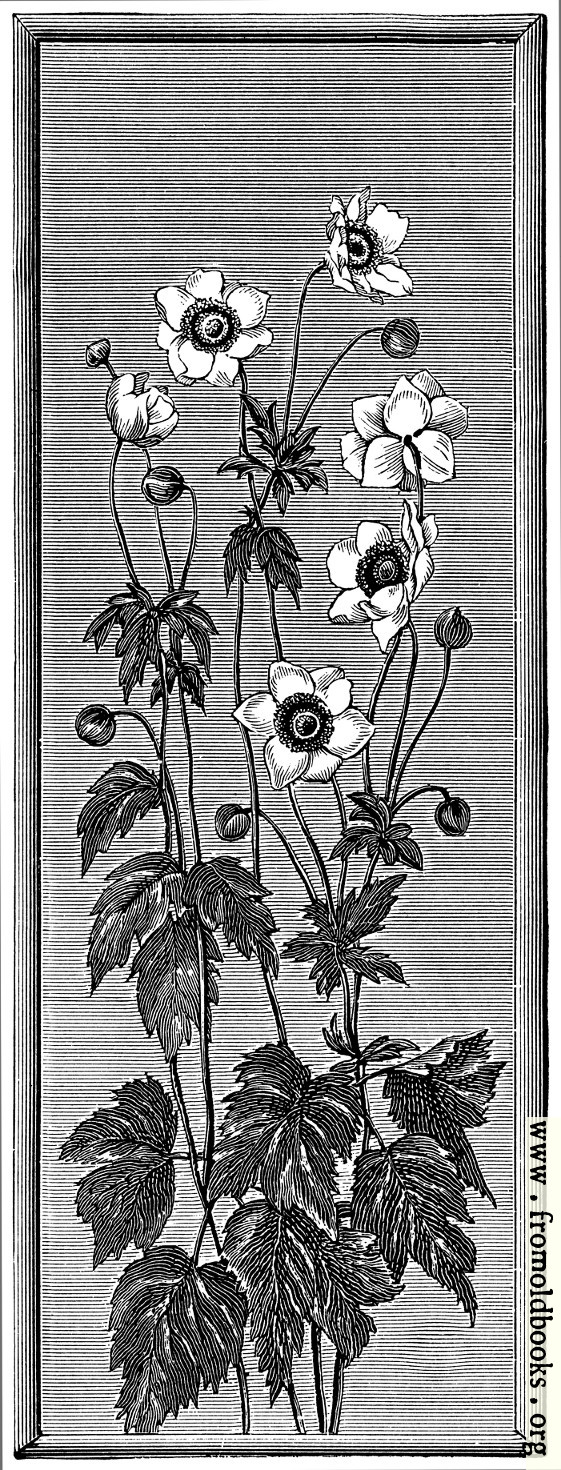 The Annual Exhibition of Paintings on China at the galleries of Messrs. Howel and James, in Regent Street [London], has already become quite an institution. [...] “Autumn Anemones,” by Miss Alice Argyles, has a merit of colour that is of course lost in our illustration (page 393). The effect of the pale rose-pink flowers on a delicate grey ground is very plesaant. The painting is a little black in the shading of the petals, and the composition is scarecely sufficiently ingenious for a decorative panel. There is space “to let” above the topmost flowers, and below, the leaves are rather crowded, and one of them is even cut off by the margin instead of beng designed within it. We mention this, not because we think the panel unworthy of the prize givenby the Grand Duchess of Mecklenburg Strelitz, but because the decorative idea seems to be so little grasped by amateurs. There seems to be a notion prevalent that it is a neasy thing to do decorative work; yet nothing is less frequent than design that is truly decorative. (p. 394)