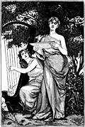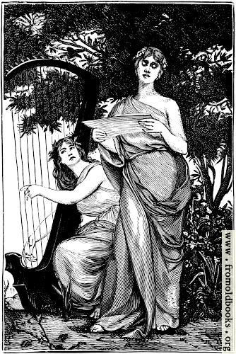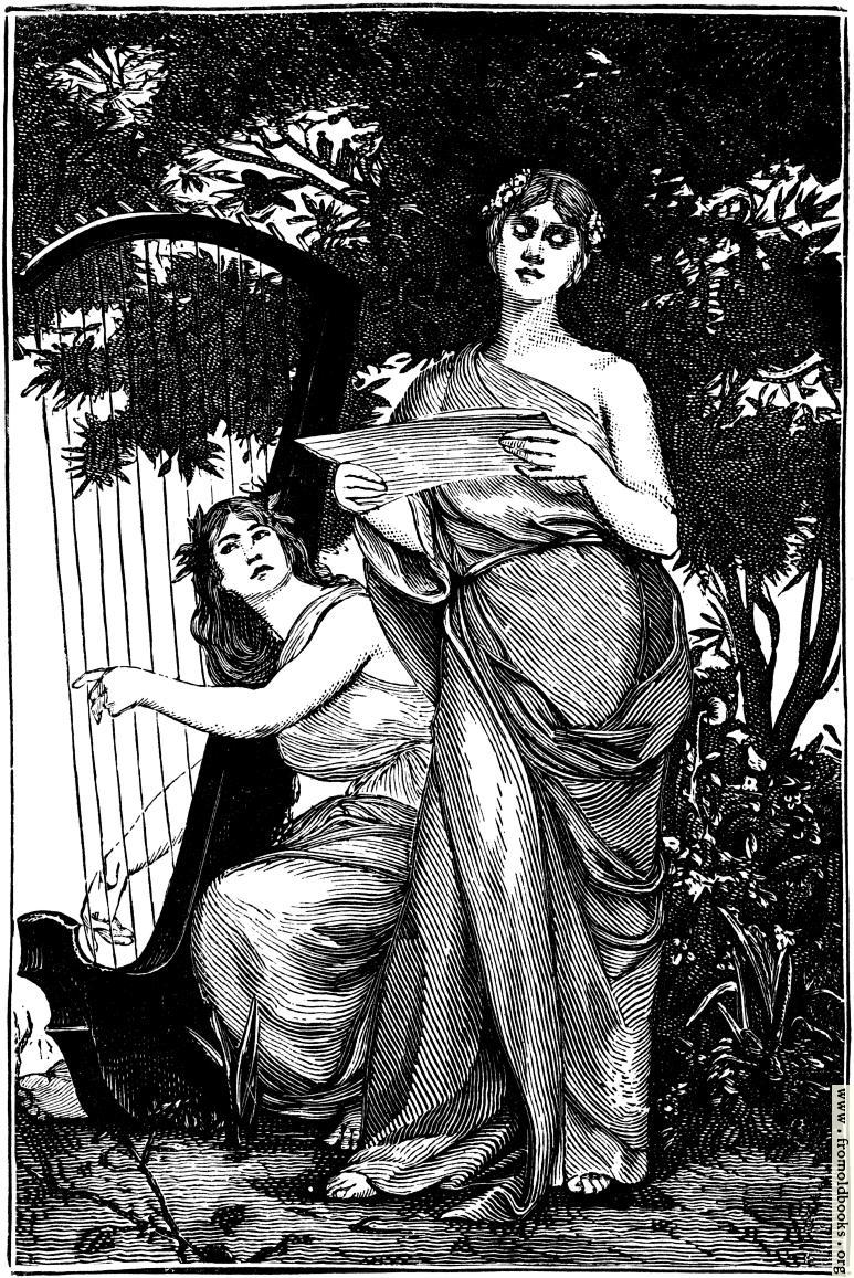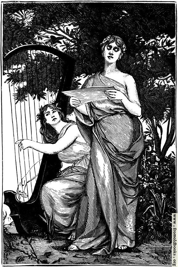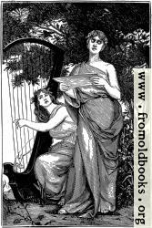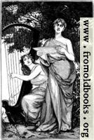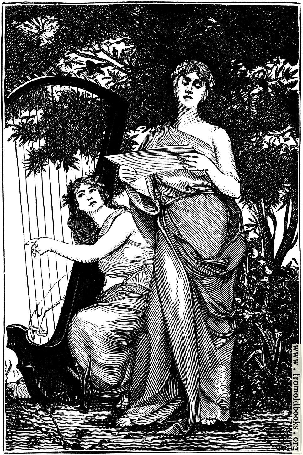 One woman sings from a sheet of music, and another accompanies her onthe harp; both are under the shelter of a tree. They wear classical gowns that leave one shoulder bare, and are barefoot, but they have flowers worked into their hair.
