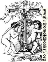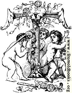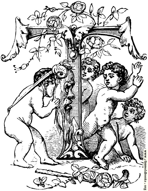 A cherub or putti holds up a bearded man’s facemask to scare the three other cherubs in this decorative initial letter “T” used as a drop cap. The capital T has floral decorations as well as wild roses growing up it, pining for Valentine’s Day perhaps!