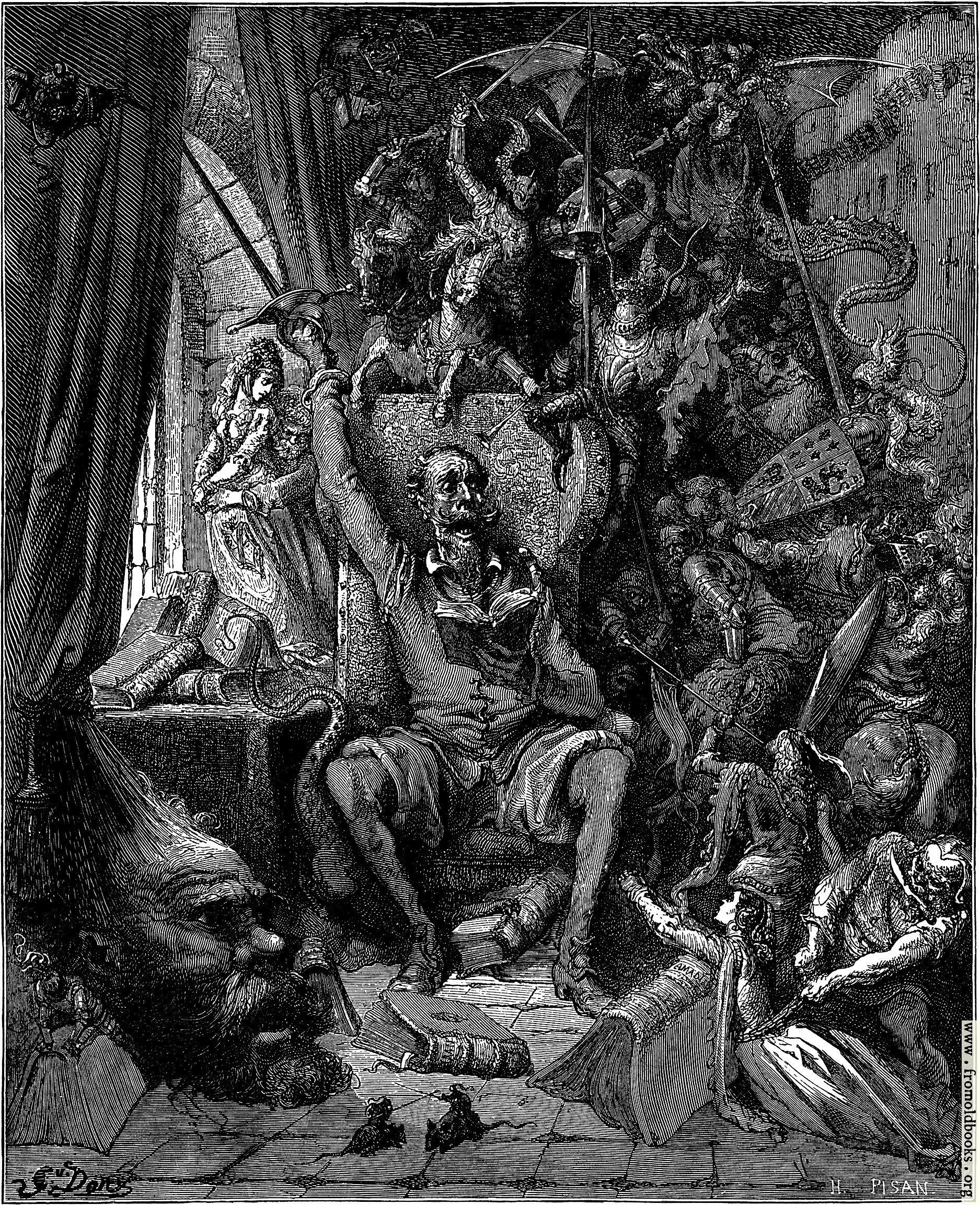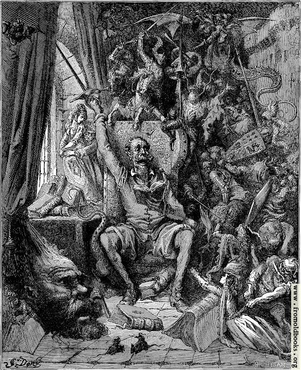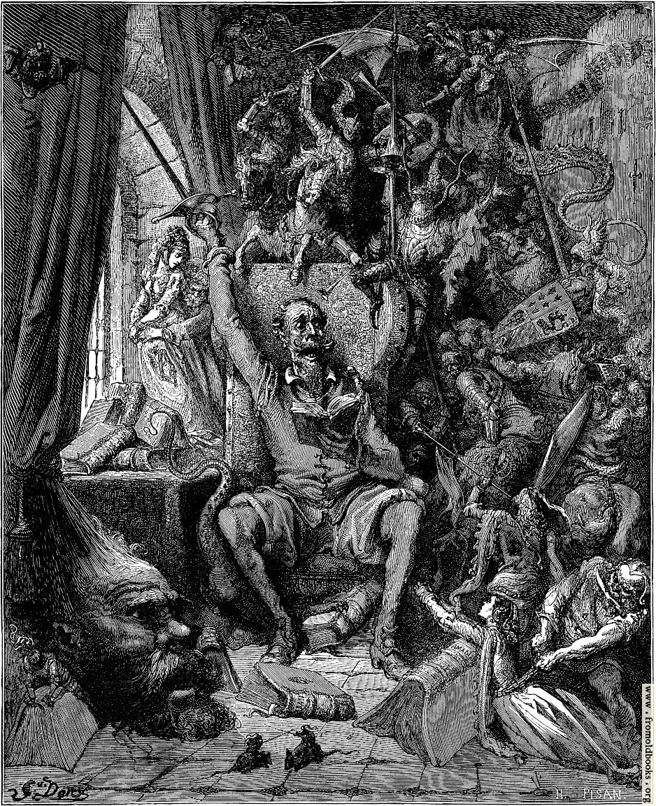 We can do no more than play at swords with him (in our frontispiece) in his study chair. His eyes are fixed and glassy; his face is quick with passion and heroic resolve; in his brave right hand he brandishes Durandal, the good sword; and about him, made real to his inner eye, there roars and clashes and seethes the whole mythology of Chivalry. Amadis charges at him from his shoulder; here are Tirante the White, and Galaor the Inconstant, and the peerless Roland. There frowns the enchanted pate of the giant Caraculiambro; there Morganto hales off the Princess of Trebizond; there are the griffins, the dragons with sail-broad vannes, the enchanted castles, the pennons and banners and destriers—all the welter and coil of adventure gone mad; all the phantasms of knight-en-antry flung together in one brilliant and bewildering pell-mell. (p. 226)