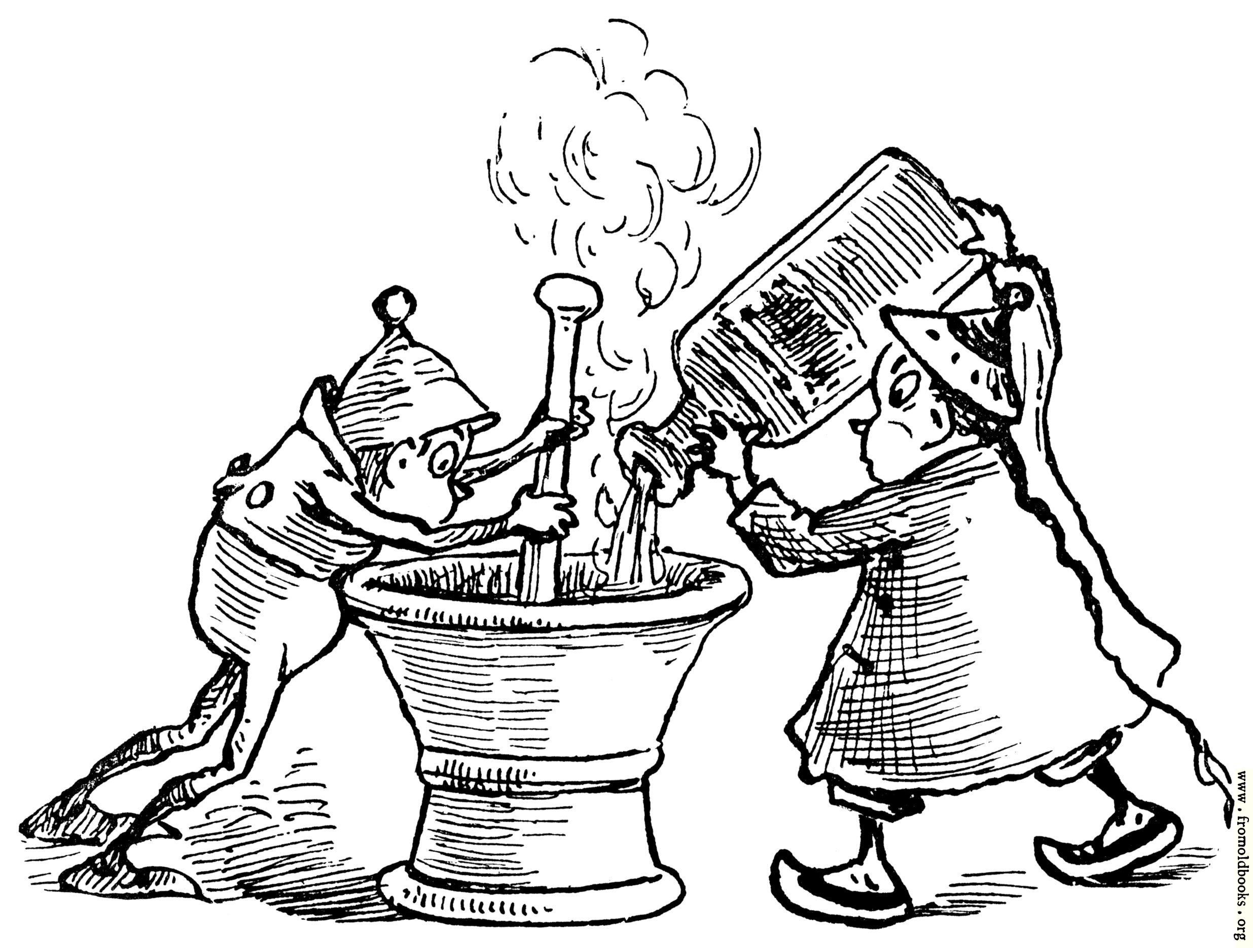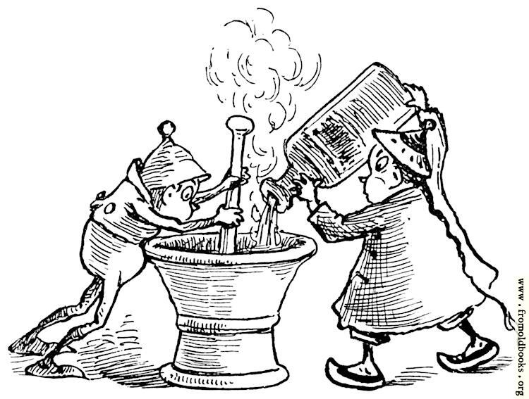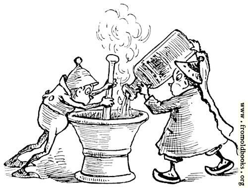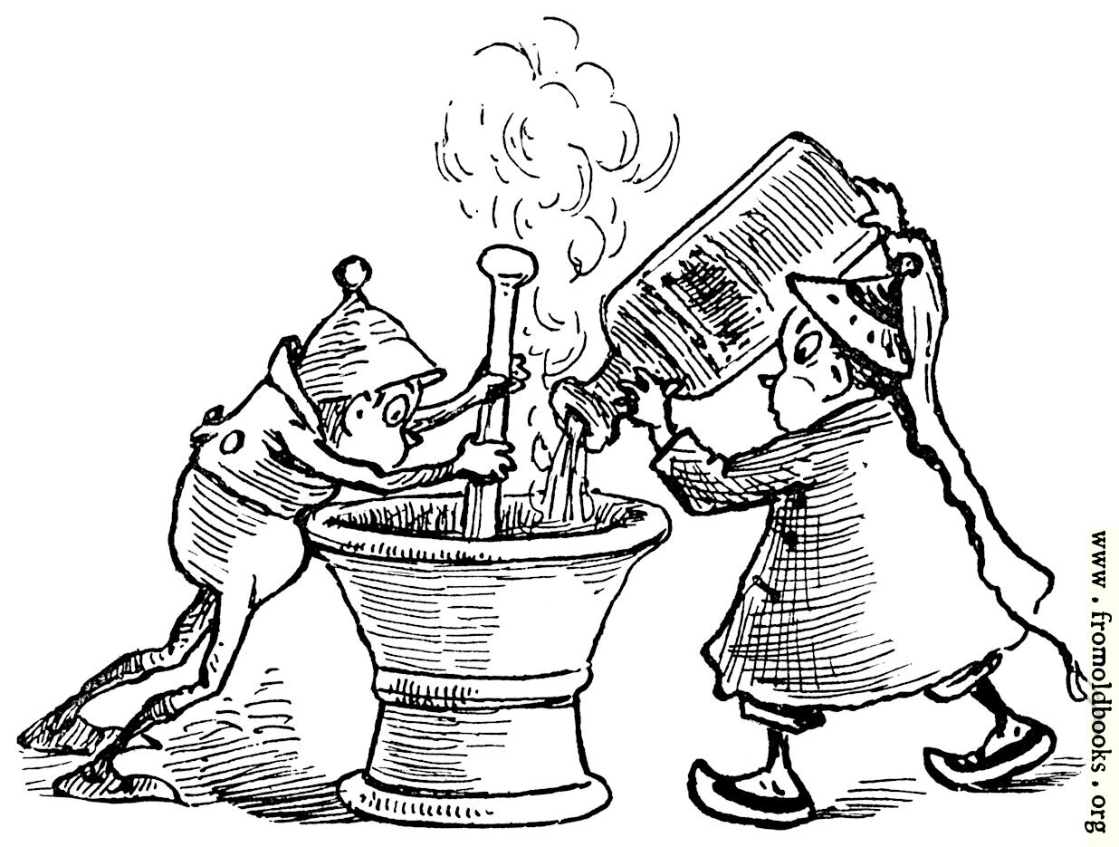 Two brownies stand one on either side of a steaming mixing pot or crucible. One brownie holds the pestle or stirring rod. The other brownie lifts a bottle into a crucible or pestle and mortar. The mix is steaming. The cricible is as tall as the chests of the two creatures doing the mixing—or rather, the brownies are very small creatures.