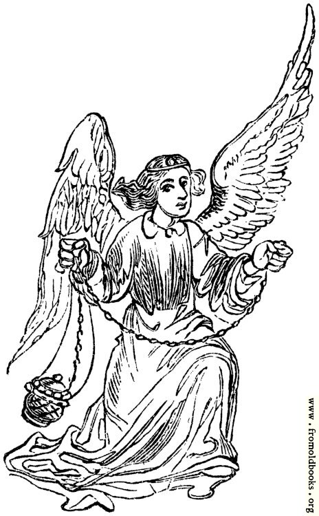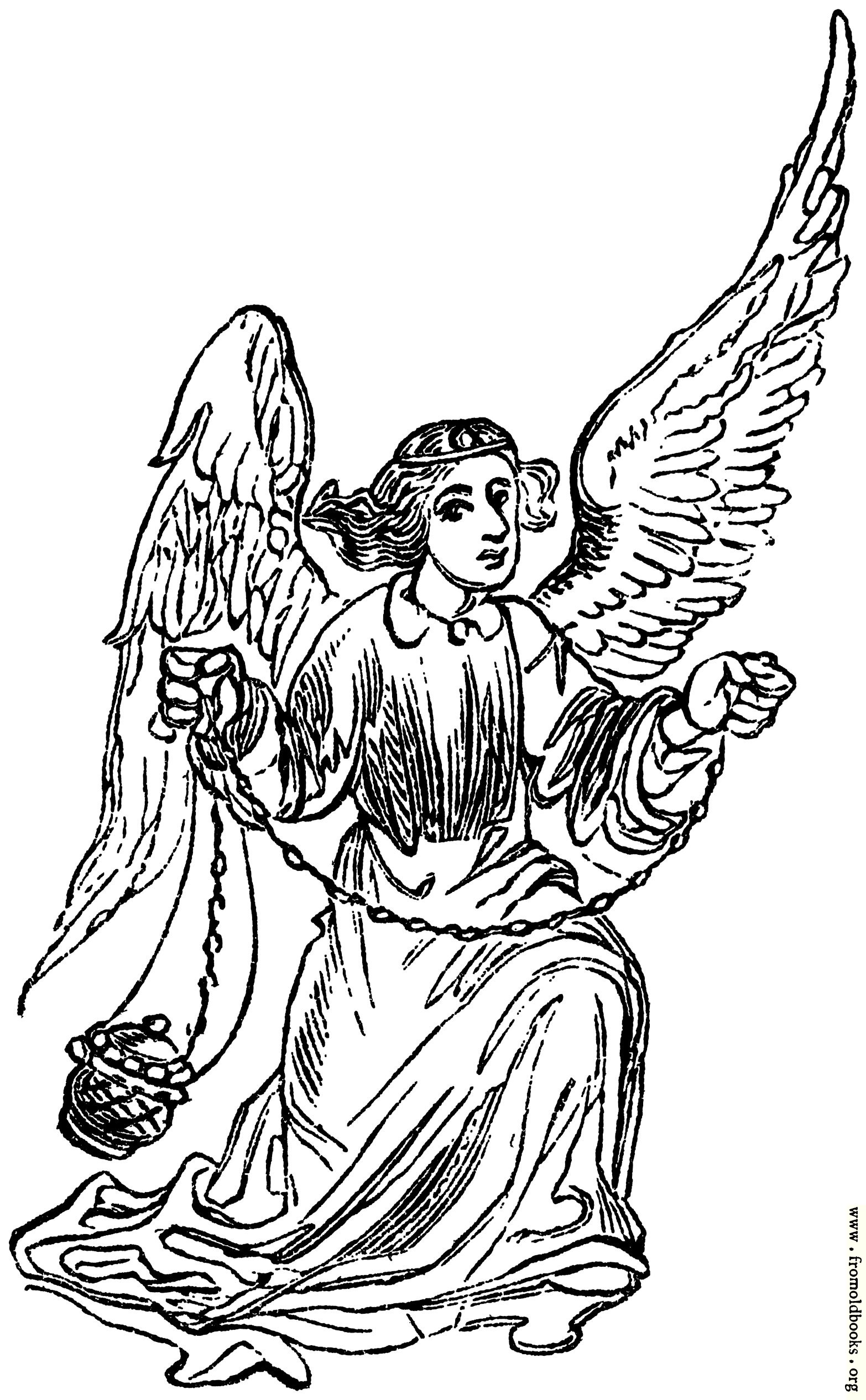 This angel is on one knee, his flowing hair bound with a circlet, his wings behind him. He holds one end of a chain in his left hand and the other in his right; from the right end of the chain dangles a thurible, or censer. These are used in Orthodox, oman Catholic and high Anglican churches to burn incense, with the smoke supposed to represent prayers going up to heaven (where the angel should already be, so maybe this is a fallen angel).