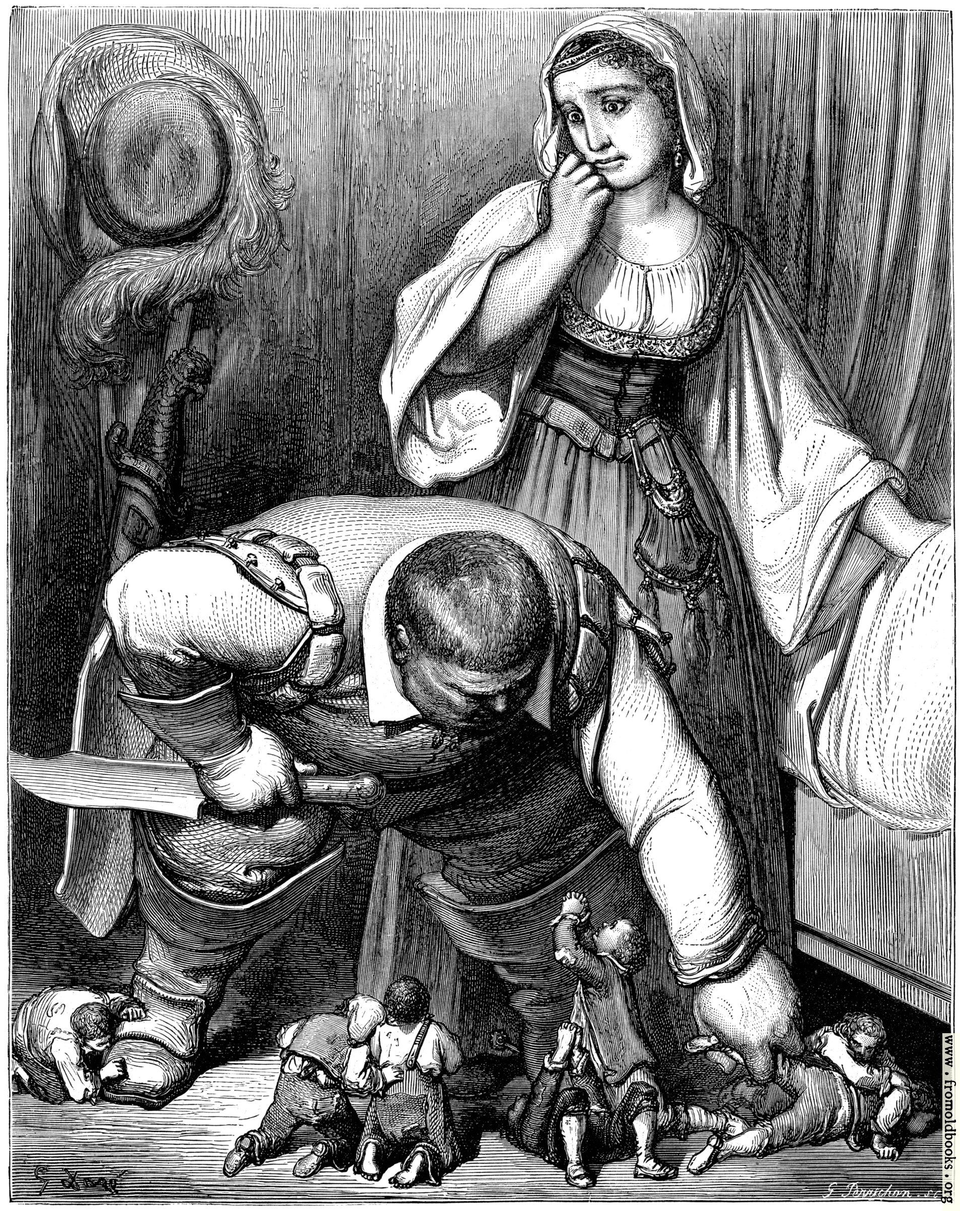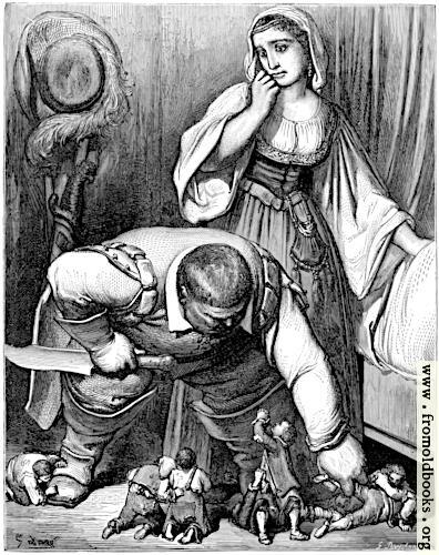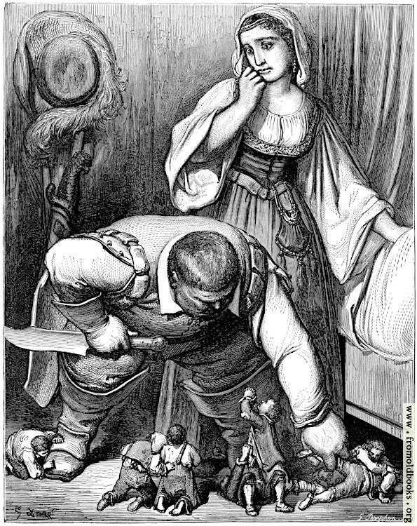 The emotions of the children (who actually appear to be shrunken adults in the picture) and of the wife are especially well portrayed in this masterful illustration by Gustave Doré.