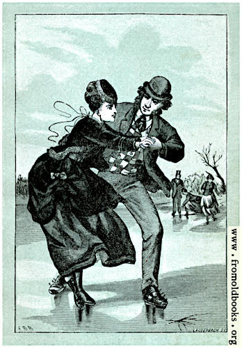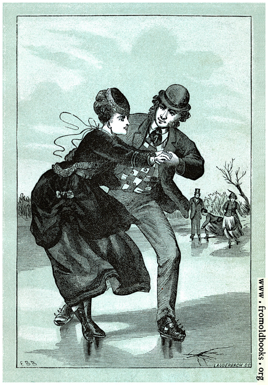 A lady with a cap tilted forward to her eyebrows, a fur-edged top, a long dreass, skating boots, is on the ice outdoors with a man in a bowler had with a checked waistcoat. In the background a man with a top hat and teo ladies, one of whom is down on one knee, perhaps to fasten her skate.