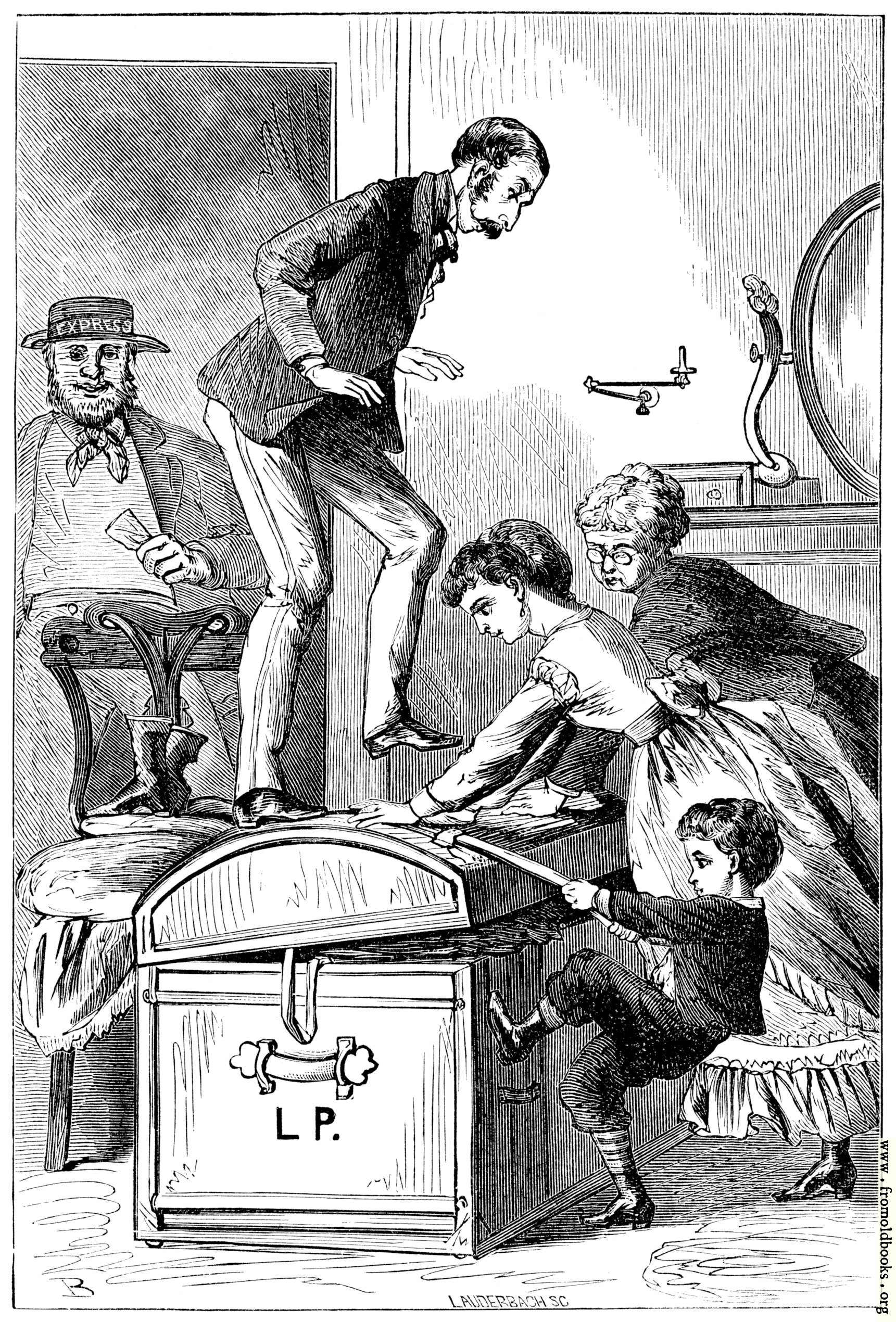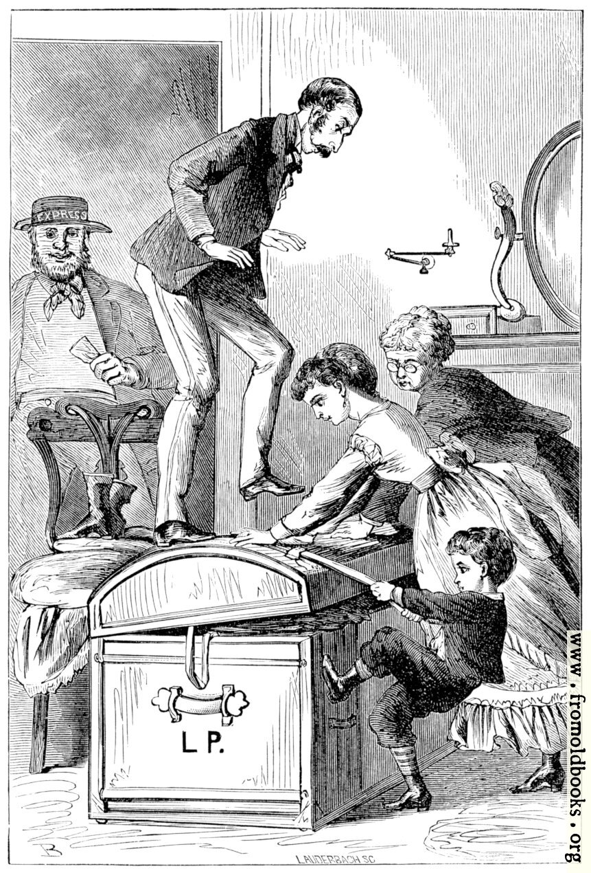 The picture shows a man with a sad and dropping moustache jumping on top of a trunk (or suitcase, as we would say today), trying to close it. A boy pulls on a strap and two ladies press down to try to help. In the background a man with Express on his cap arrives, presumably to transport the man with the trunk to the airport. Well, to a ship. Alas, the trunk is over-stuffed and won’t close.