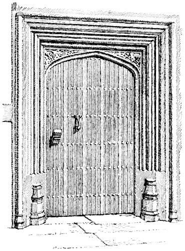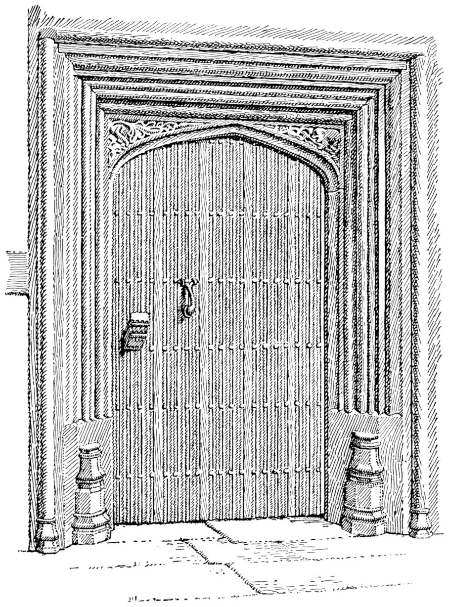 The door within the porch at Bexon (page 34) may be contrasted with another, from Royton, Lenham, in the same county (page 9). Both are representative of old methods of door construction. The Royton example is composed of a series of boards tongued into one another at the edges. This kind of door-boarding may be moulded as in the present instance—a plan common to East Anglia and West Flanders— somewhat after the manner of linen-fold patterns, only with the mouldings running continuously from top to bottom, without conven- tional finish at the extremities; or it may consist of plain boards, put together like weather-boarding, but vertically of course, the prominent overlapping edges giving an effect of relief or of light and shadow, in place of moulding or any further ornament. The second type of door, of which that at Bexon is an instance, is composed of flat boards, edge to edge, with a moulded fillet covering each joint. Either type of door would usually be studded with nails arranged, as in these two cases, in horizontal lines, or sometimes in much more elaborate devices. Either type, again, is strengthened with transverse boards, or some simple framework, on the inside. The Royton door is much the more ancient of the two, and comprises, moreover, a feature now practically obsolete, viz., the wooden latch, or “heck,” as it used to be named in bygone days. The doorway is of a familiar form of late Gothic. Its head is four-centered, with carved spandrils. Heavy mouldings are carried round the top and almost down to the base of the jambs, until arrested by polygonal moulded stops. The Bexon door-head is more depressed, the point at the apex, obtuse enough in the Royton example, being no longer discernible in this. But the same traditional motif of carved spandrils, of mouldings and stops, albeit on a diminished scale and with shallower cutting, may still be identified. (p. 31)