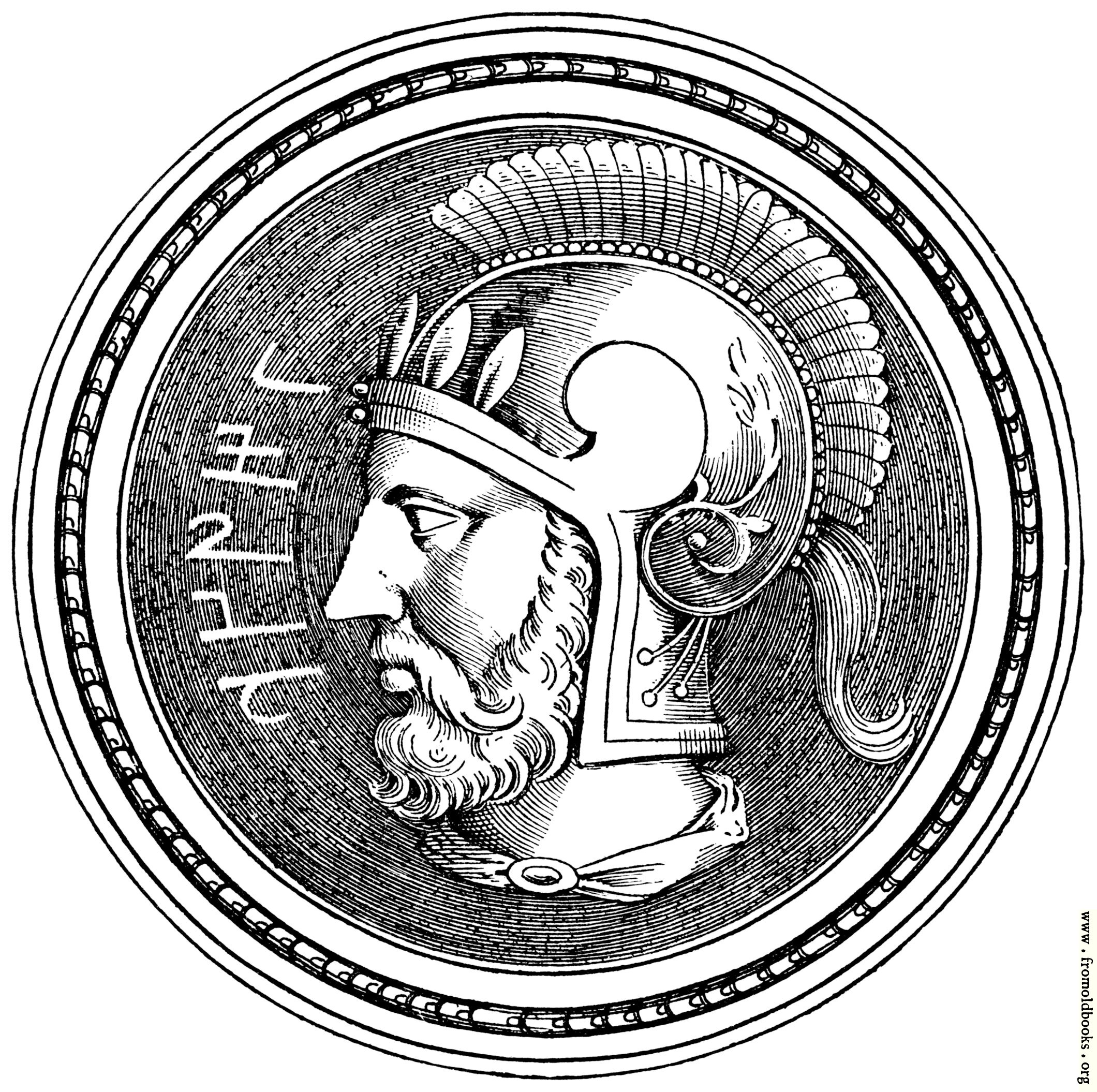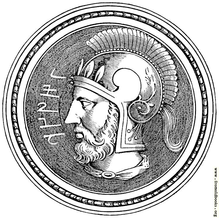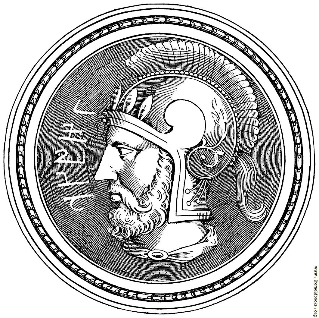 We see only a man’s head, complete with pupils in his eyes, from one side. looking to our left. he wears a helmet with a “Mohican” crest from front to back and feathers (perhaps of metal) in the front. He has a combed beard and moustache, which is long at the sides and curls down and then back. Abouthis neck a broach-fastened toga.