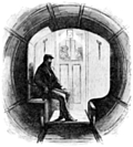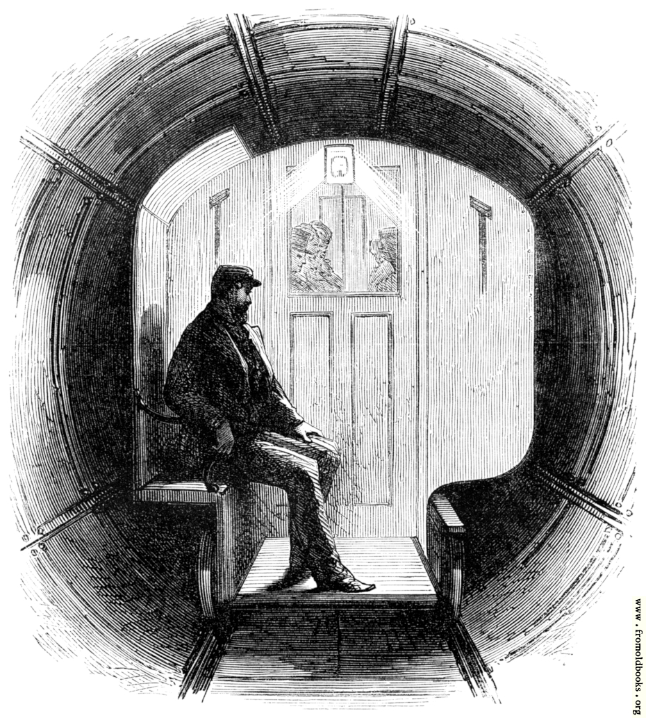 A workman sits in a rather small “omnibus” or railway carriage, seemingly outside the door on a bench, his booted feet resting on an extension of the carriage floor that reaches two railway wheels. This was a narrow-gauge train. He is not well lit, but through the glass window in the wooden door behind him we see people inside the carriage itself.