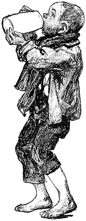 This shoeless boy is taken from a cartoon, Family with barefoot boy. What is he drinking?