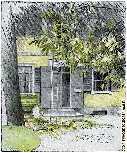 A front door, with open wooden shutters, one having a bag hanging perhaps for mail. Windows on either side with open shutters and bars over the glass; a green bench by the door; an oval frieze containing a of the artist; a basket, perhap with grapes and a streaming festoon, or perhaps the festoon is decorative. A ladder in front of the door goes up almost to the second story. A large tree in the foreground, and a short poem at lower right.