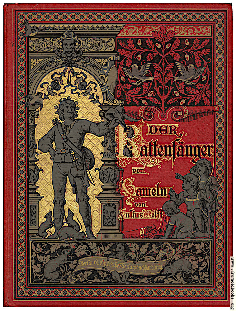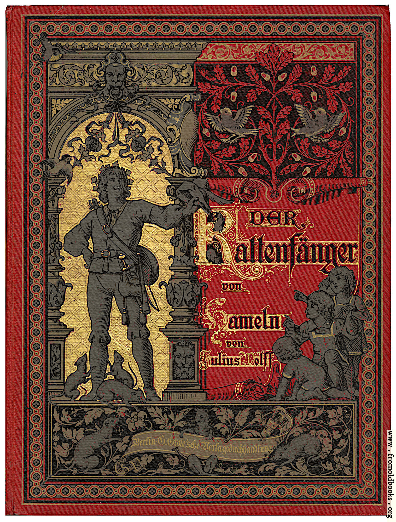 The cover is red with gold foil stamping, and features the piper with his pipe, some very large rats around his ankles, some small barefoot children, and some birds, all in a decorative frame.