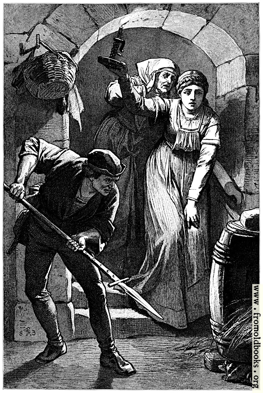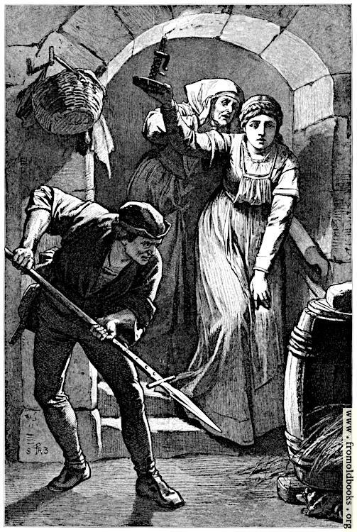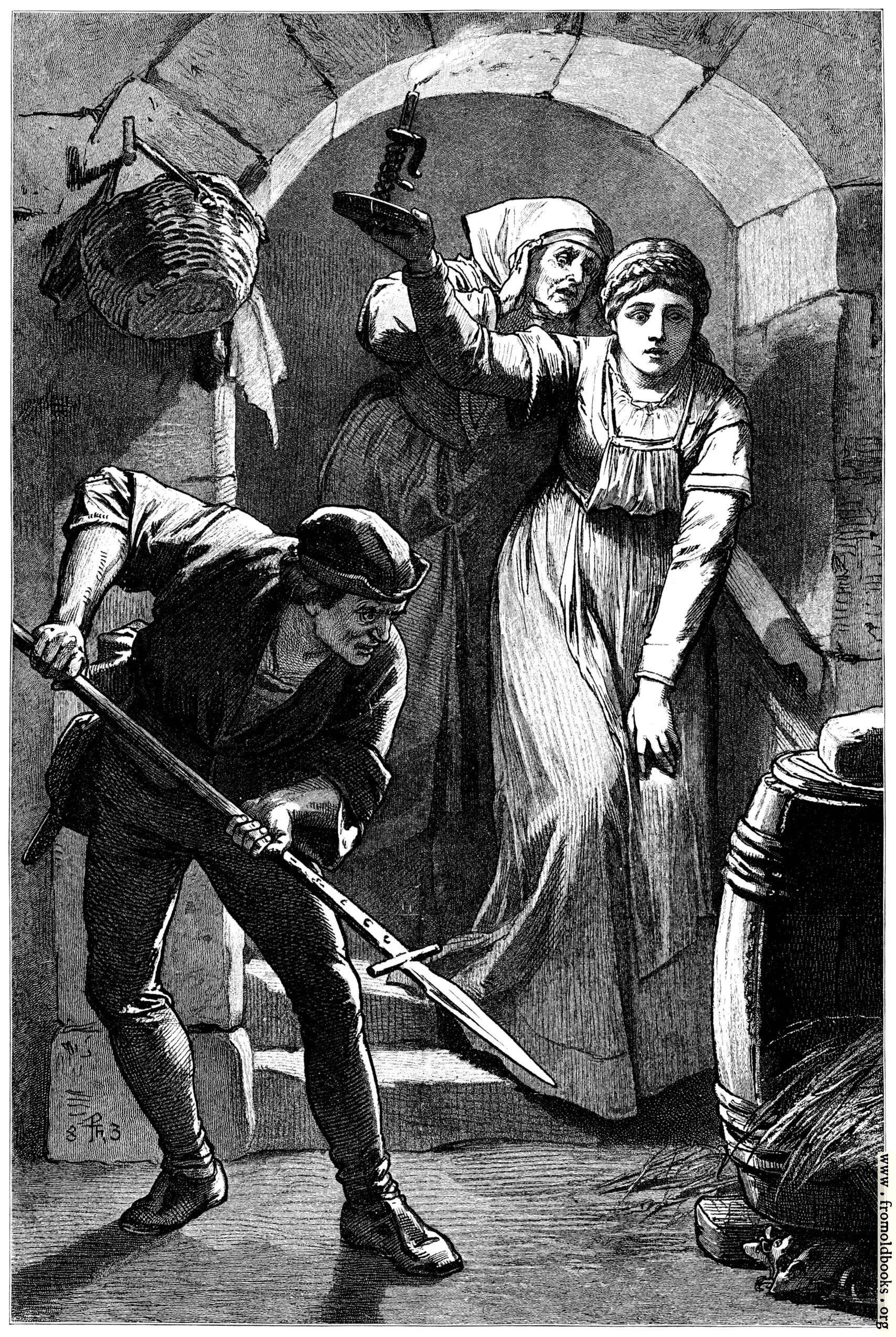 Here, he stands with a spear pointed at the rats hiding under a barrel, while two other people look on with the light of a candle heald high. They have descended well-worn ancient stone steps that end in a stone archway in the cellar.