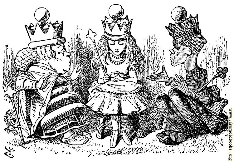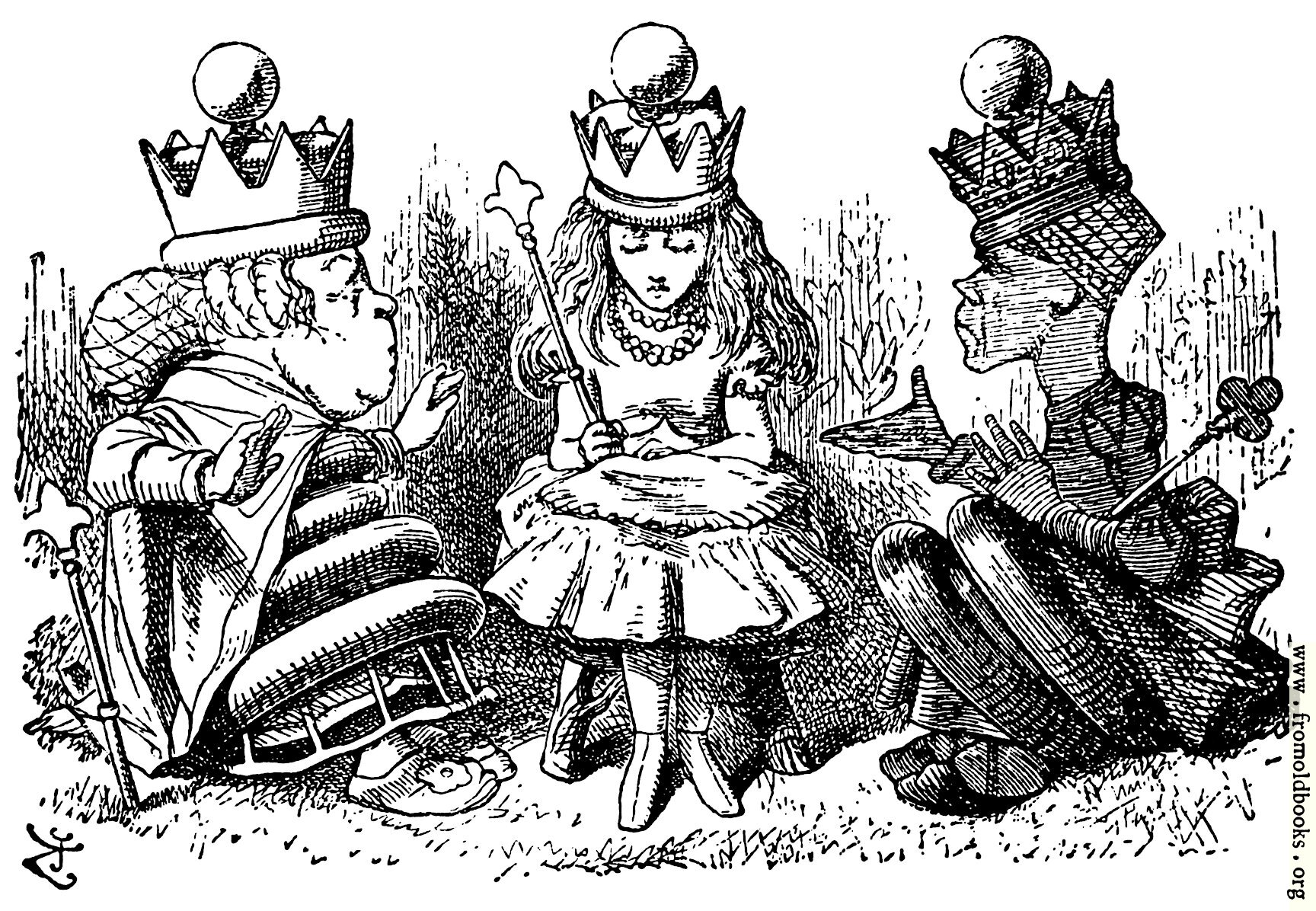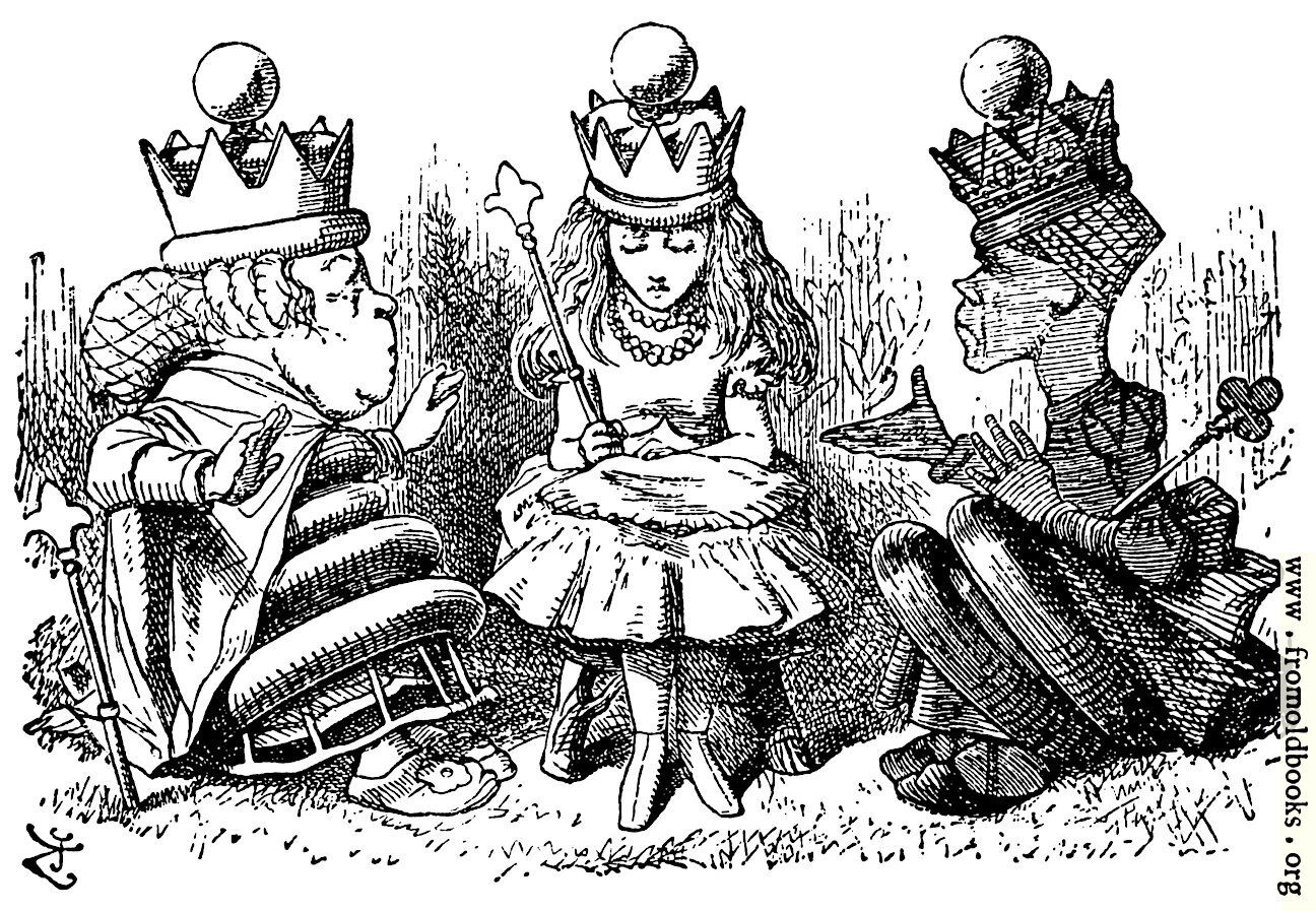 “Ridiculous!” cried the Queen. “Why, don’t you see, child———” here she broke off with a frown, and, after thinking for a minute, suddenly changed the subject of the conversation. “What do you mean by ‘If you really are a queen’? What right have you to call yourself so? You can’t be a Queen, you know, till you’ve passed the proper examination. And the sooner we begin it, the better.” (p. 187)