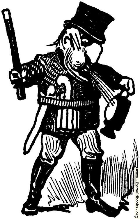A man with a large nose and a top hat and a wand is blowing at the flame in a lantern that he holds in one hand.