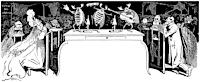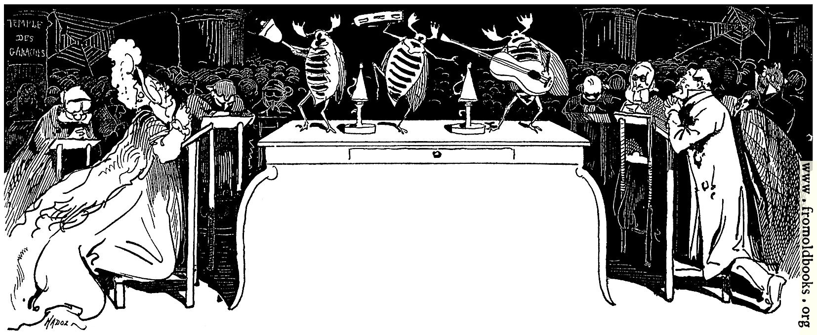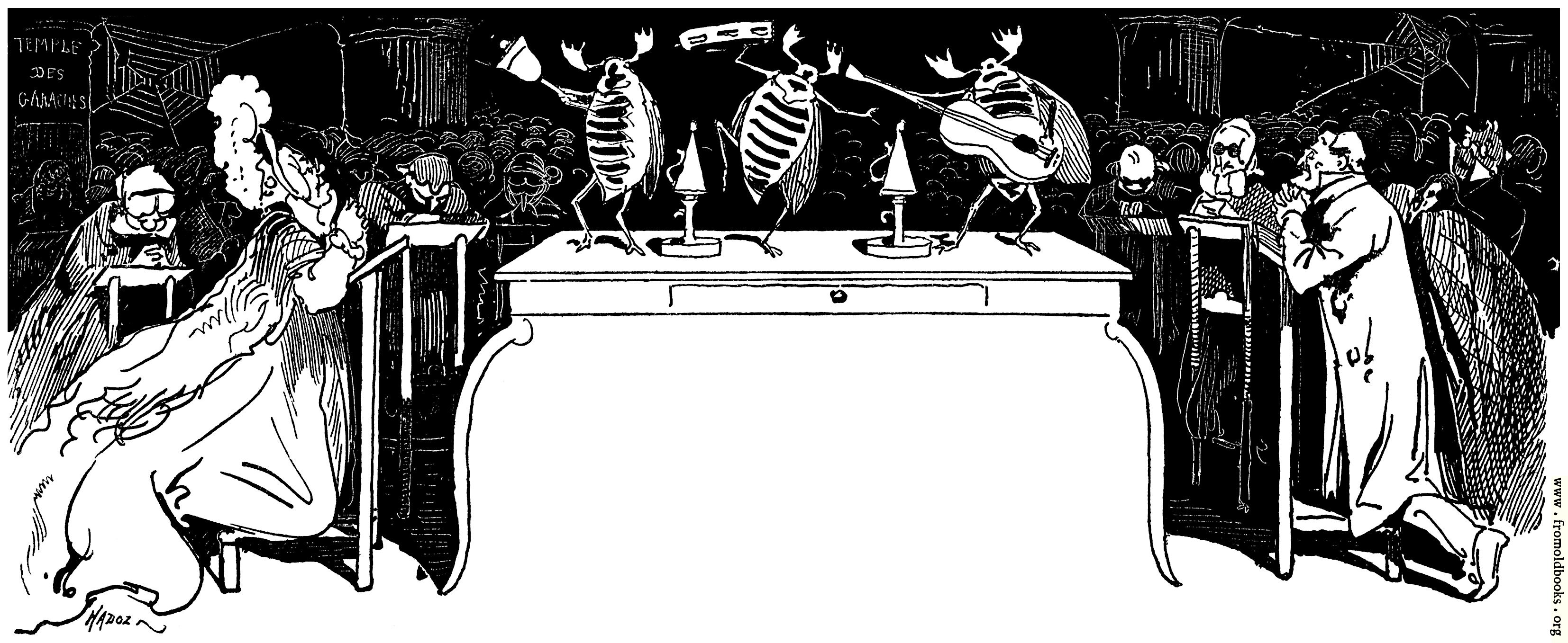 We see a heading, Les Spirites (the spirists), drawn as if from the back of a stage or platform in a dimly-lit room or theatre. There’s a large audience, but on stage maybe half a dozen people kneeling on either side of a table with a drawer, facing the table, on which are dancing three giant beetles with antlers, one with a bell, one with a tambourine, one with a guitar.