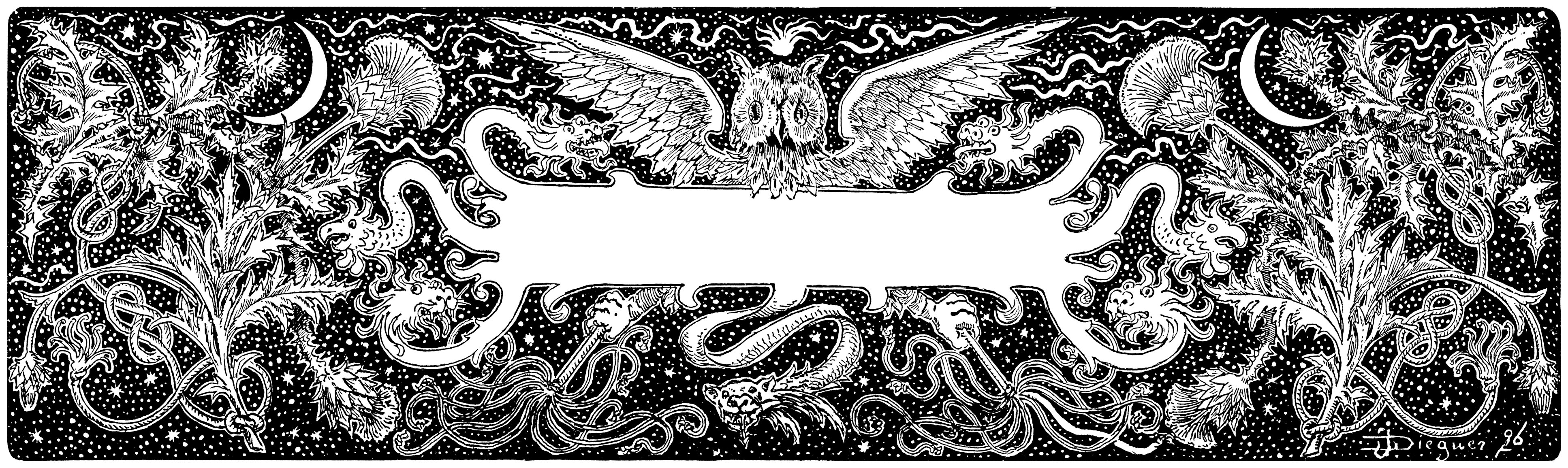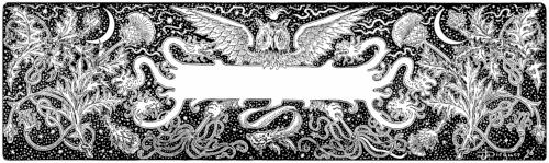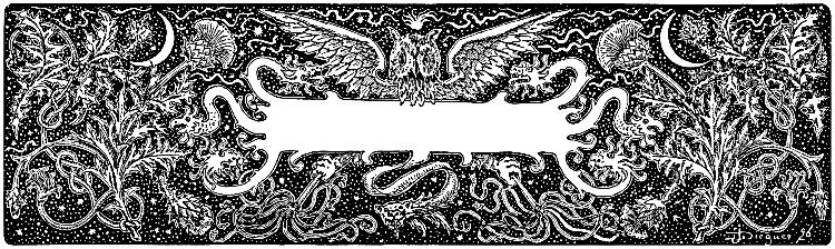 The border features an owl with wings spread, just behind the space for the words; that space ends on weither side with serpent or dragon heads. There is a cresent moon on each side, and a thistle, and beneath the space for text are two wrists and hands holding maybe magic wands or sticks that end in many snakes, or they could be ropes or wires with knots at the end, scourges used to whip people.