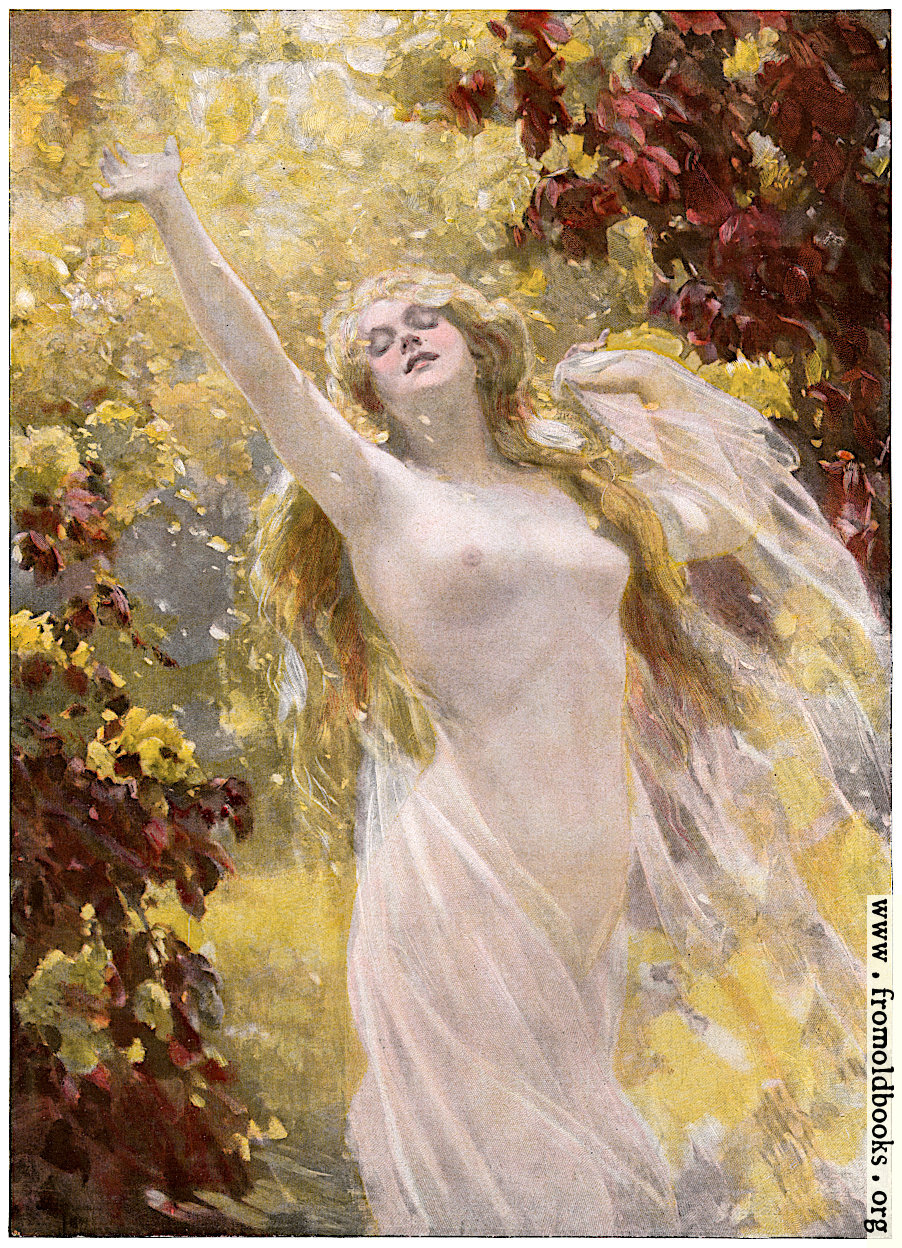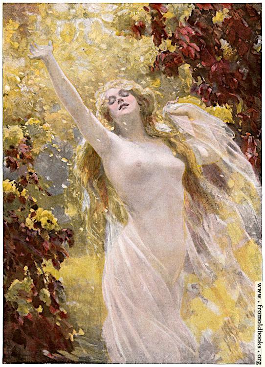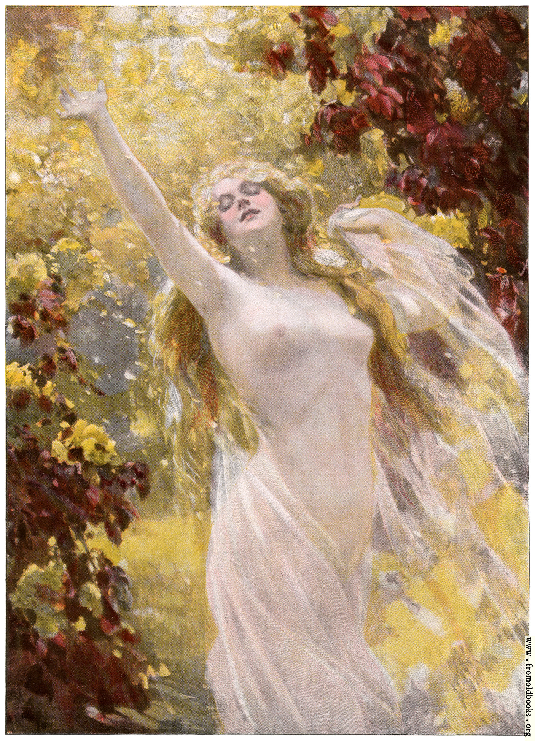 A young woman dances with one arm stretched out and upwards towards the warm Summer sun, the light shining down on her through the woodland trees in a cascade of yellow. She wears a diaphanous dress that seems to have fallen off, leaving her upper half bare. With half-lidded eyes and a half-smile, she is living inthe moment.
