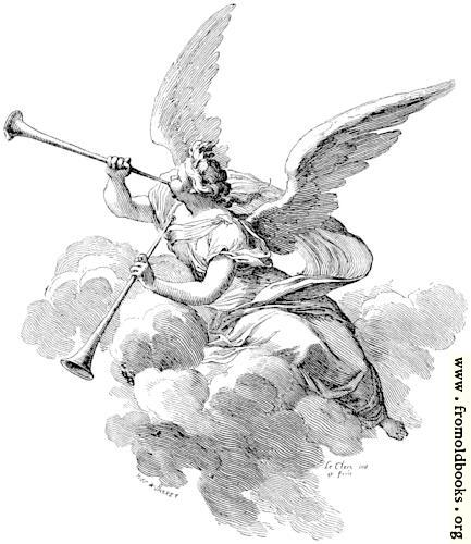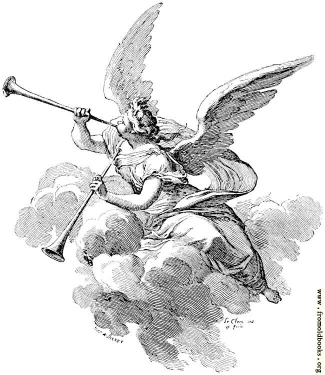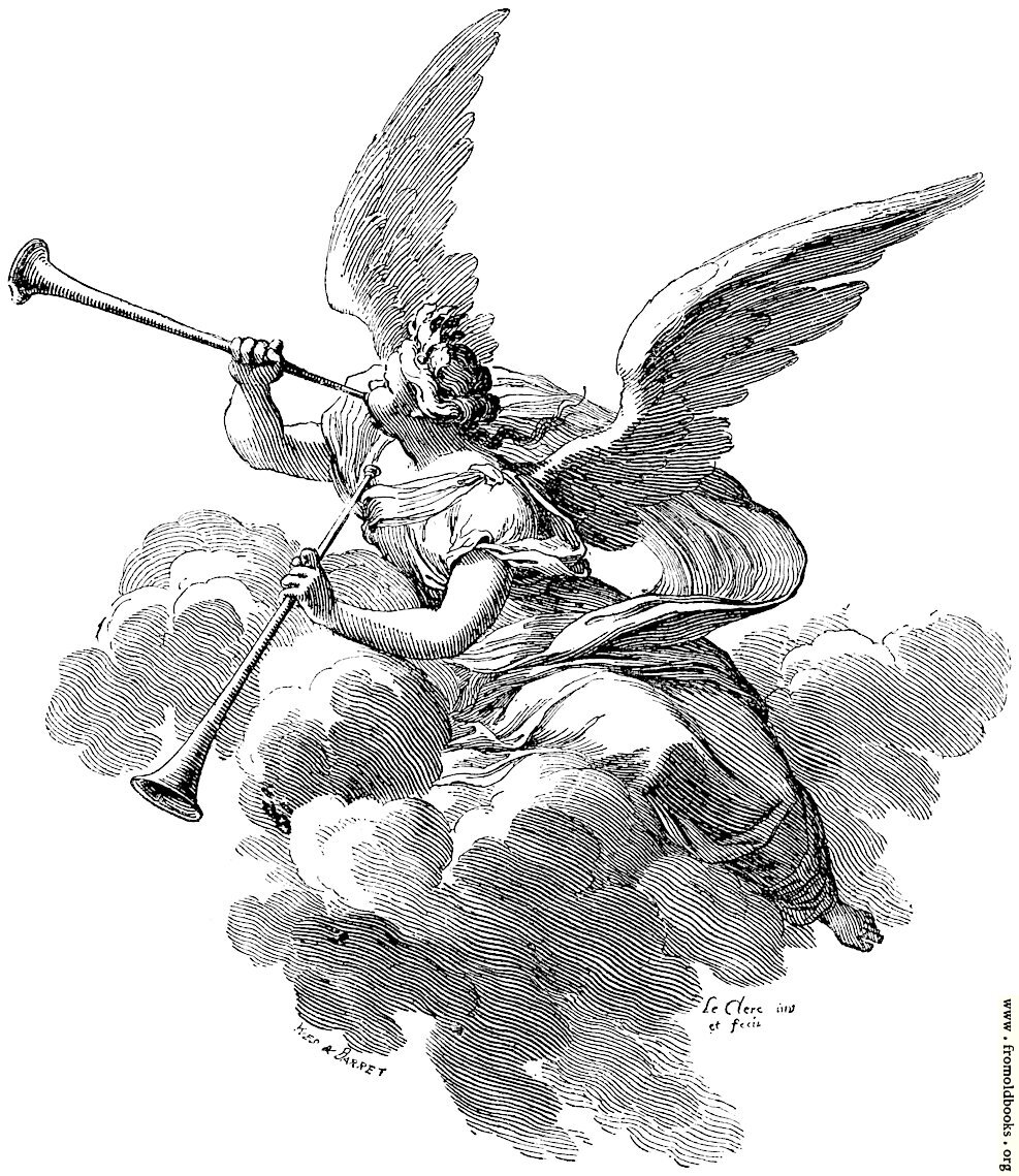 Here we have an angel with wings, barefoot and with flowing robes (or a toga maybe) and a coronet, sitting on a cloud in Heaven, with a trumpet or horn in each hand, announcing something.