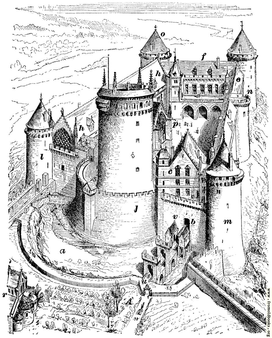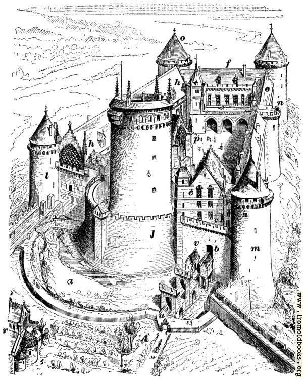 The original drawing of Coucy Castle was reproduced in the book on drawing with the parts labeled with letters; this version of the castle drawing retains those letters.