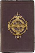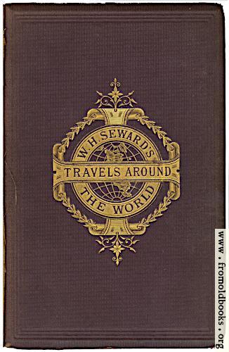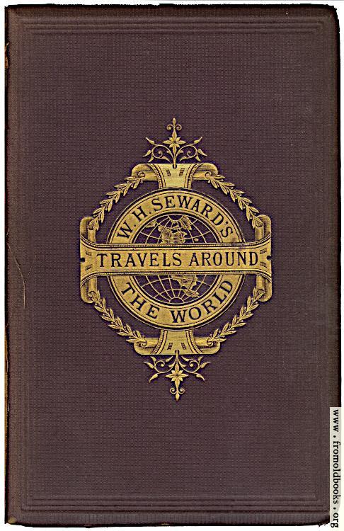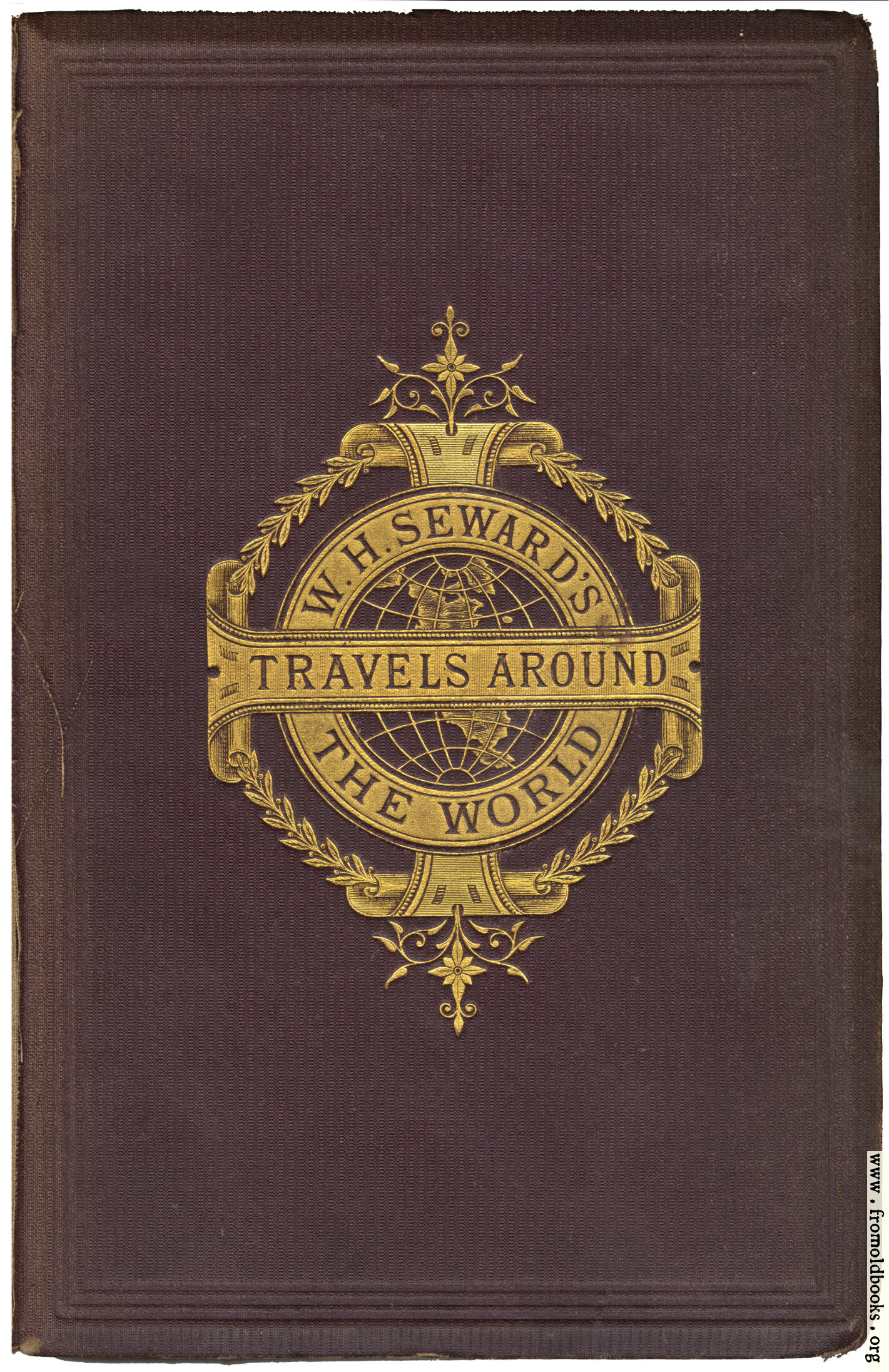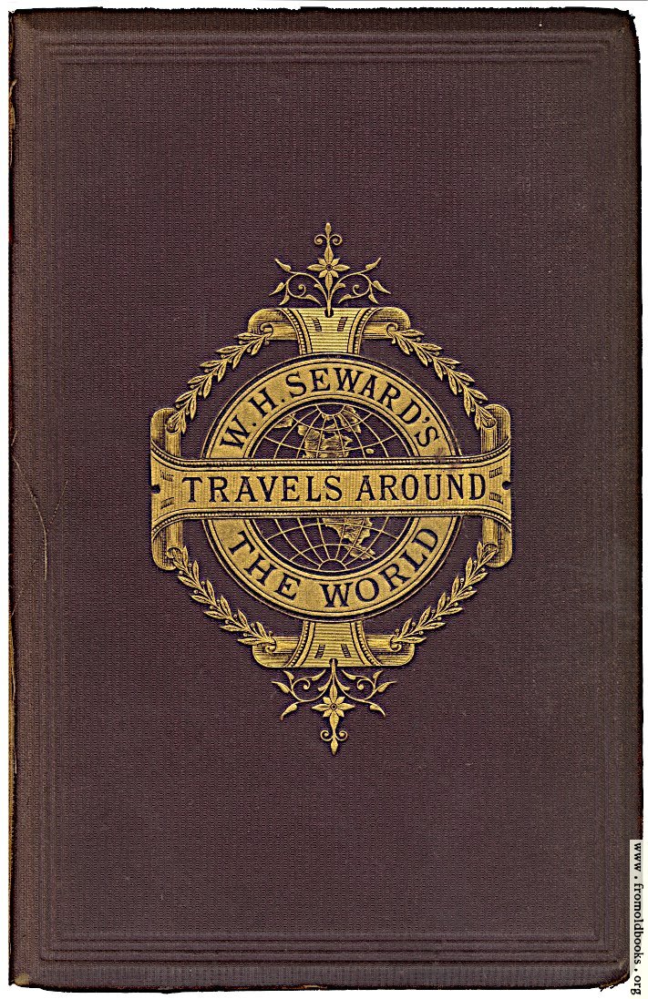 The front cover is a reddish brown with a gold design in the middle that includes laurel leaves and a globe, with the words, “W. H. SEWARD’S TRAVELS AROUND THE WORLD”, all in gold.
