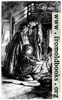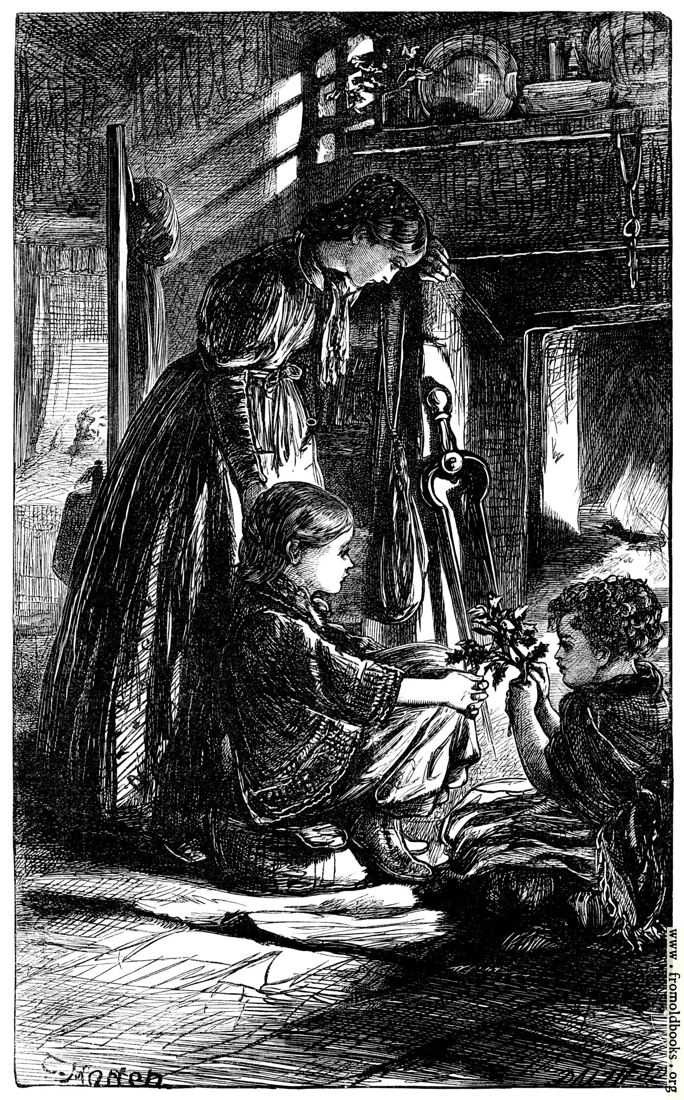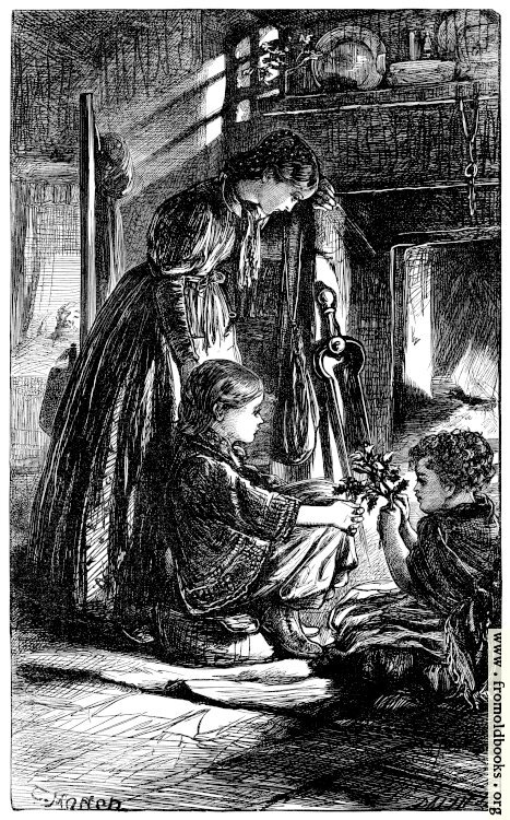 This picture, by Thomas Morten, was engraved by the Brothers Dalziel. It shows a woman and two children sitting near a lit fireplace, their heavy clothing suggesting the house is not warm. One child holds a sprig of holly, but there do not seem to be presents or a tree.