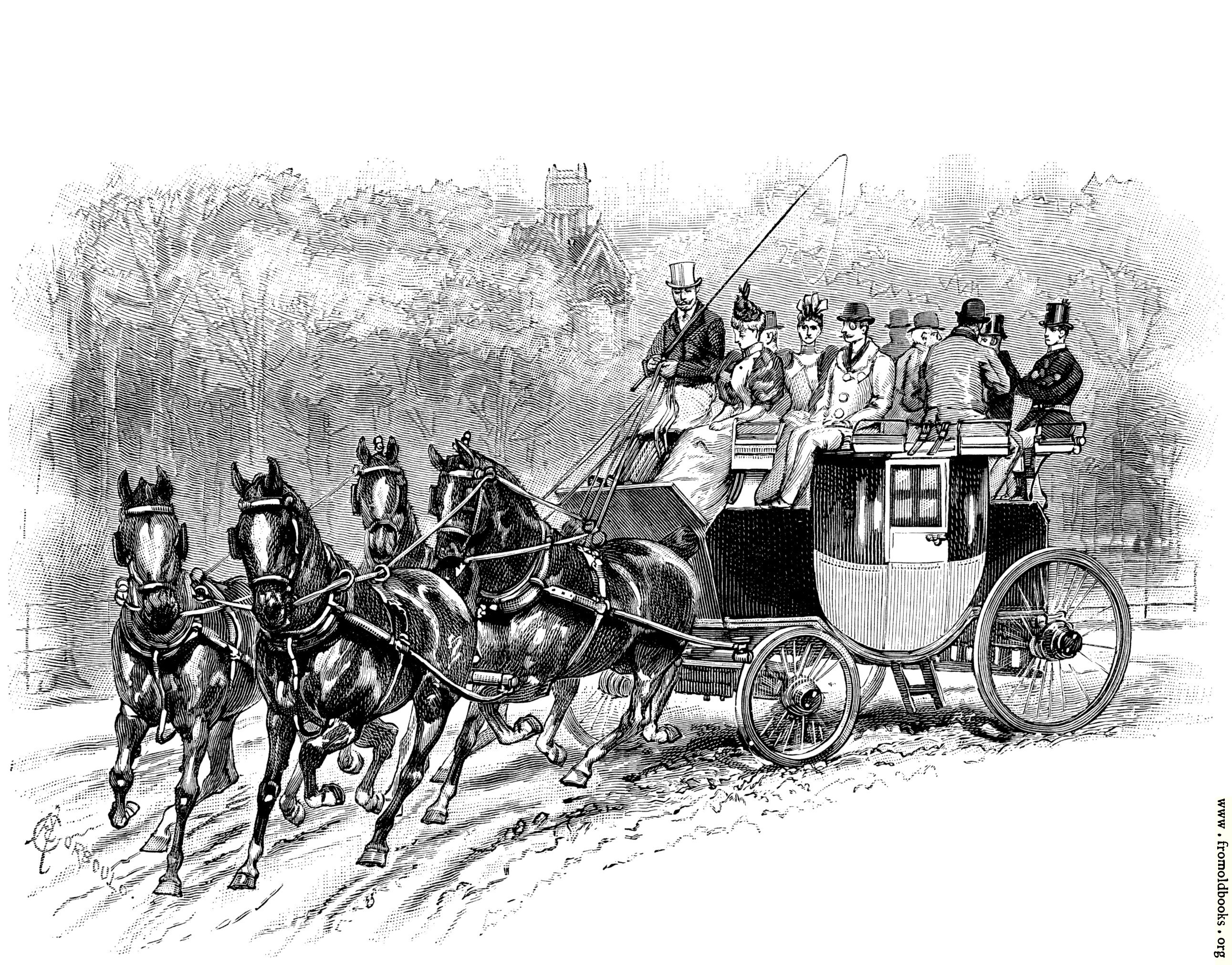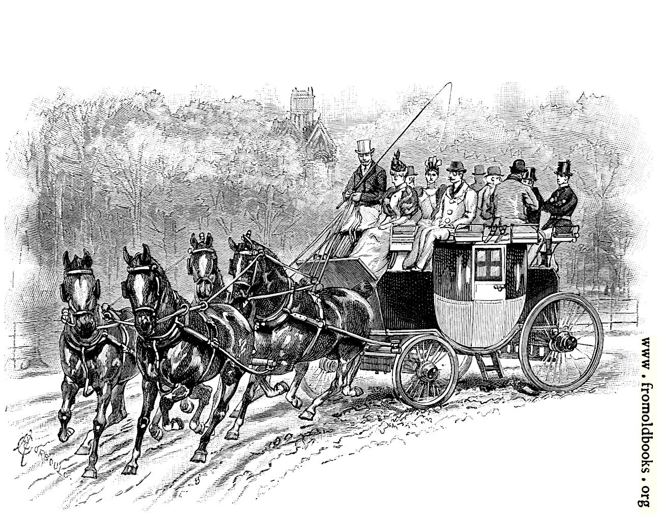 A man wearing a top hat and brandishing a long horse-whip sits at the front of a coach pulled by four horses. At least nine people are sitting on the roof, with the two at the back perhaps being footmen. In the far distance, dense foliage and a church.
