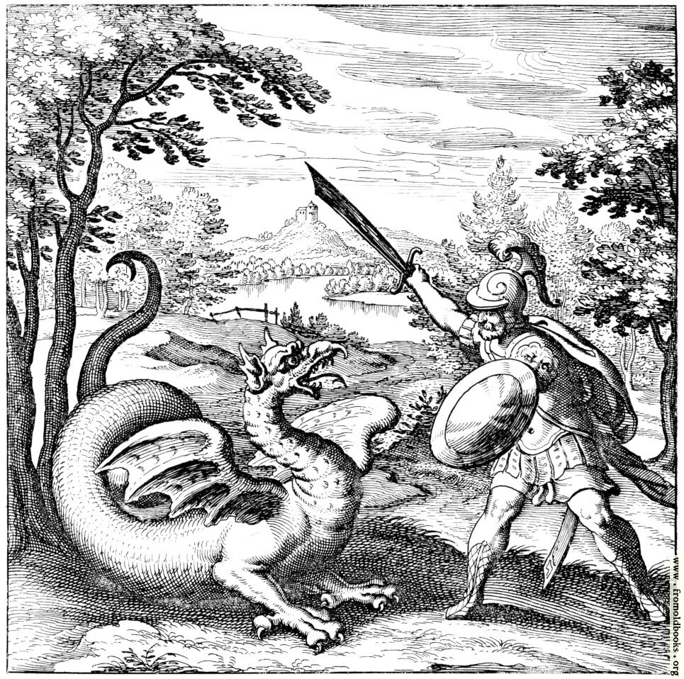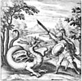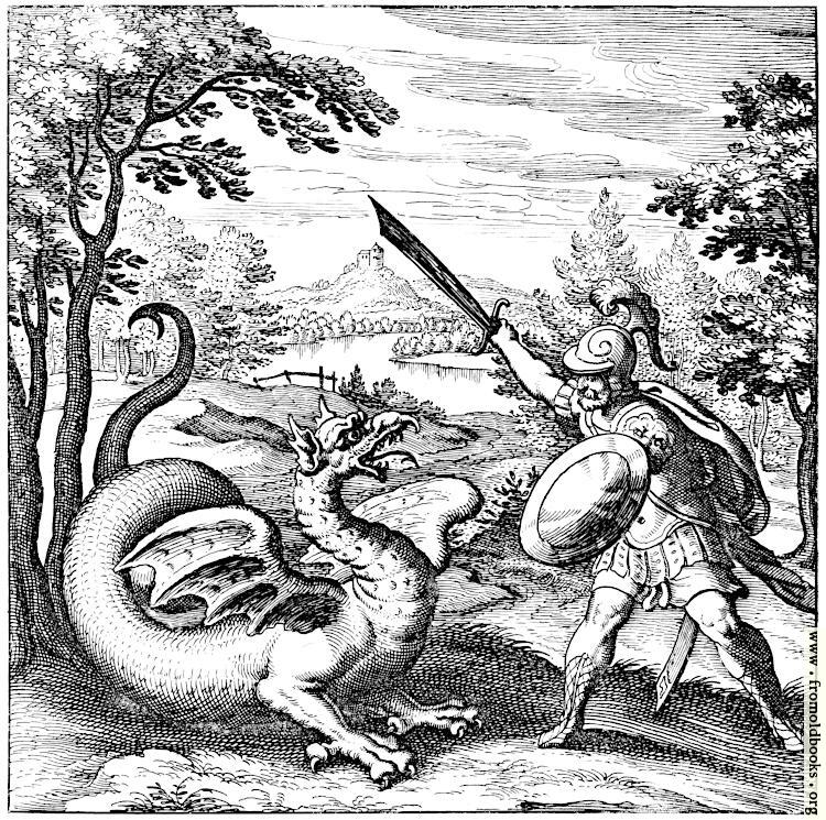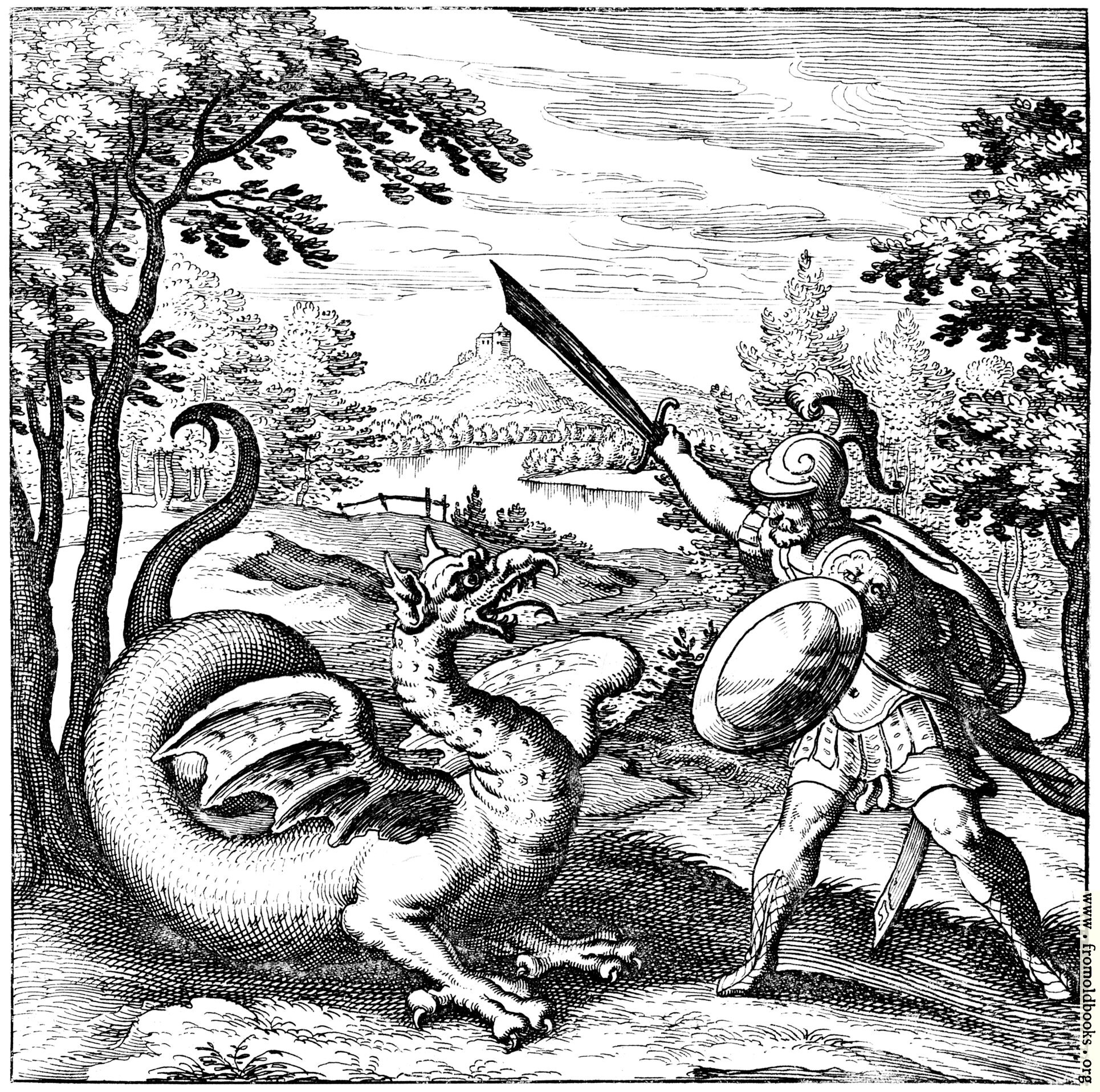 The dragon stands on the ground in the foreground with its mouth open, tongue extended, tail coiled, wings partly lifted. It faces the bearded knight, in leather armour, who wields a sword over the dragon’s head and holds a shield, a cape flowing behind him. There are trees on either side to frame the woodcut, and in the background a lake and behind that a castle on a hill.