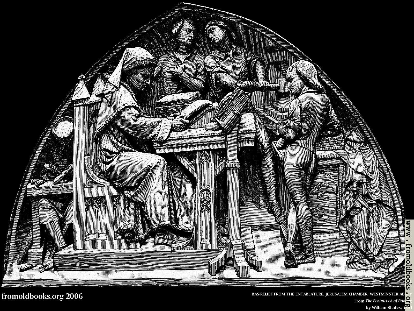 A printing office, with an engraver (I think) at left, a proof-reader, a typesetter (at the back) next to the person operating the press itself, and, at right, a boy wearing tights and I think barefoot, probably a “printer’s devil,” that is, the boy who inked the rollers.