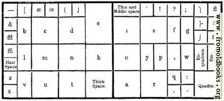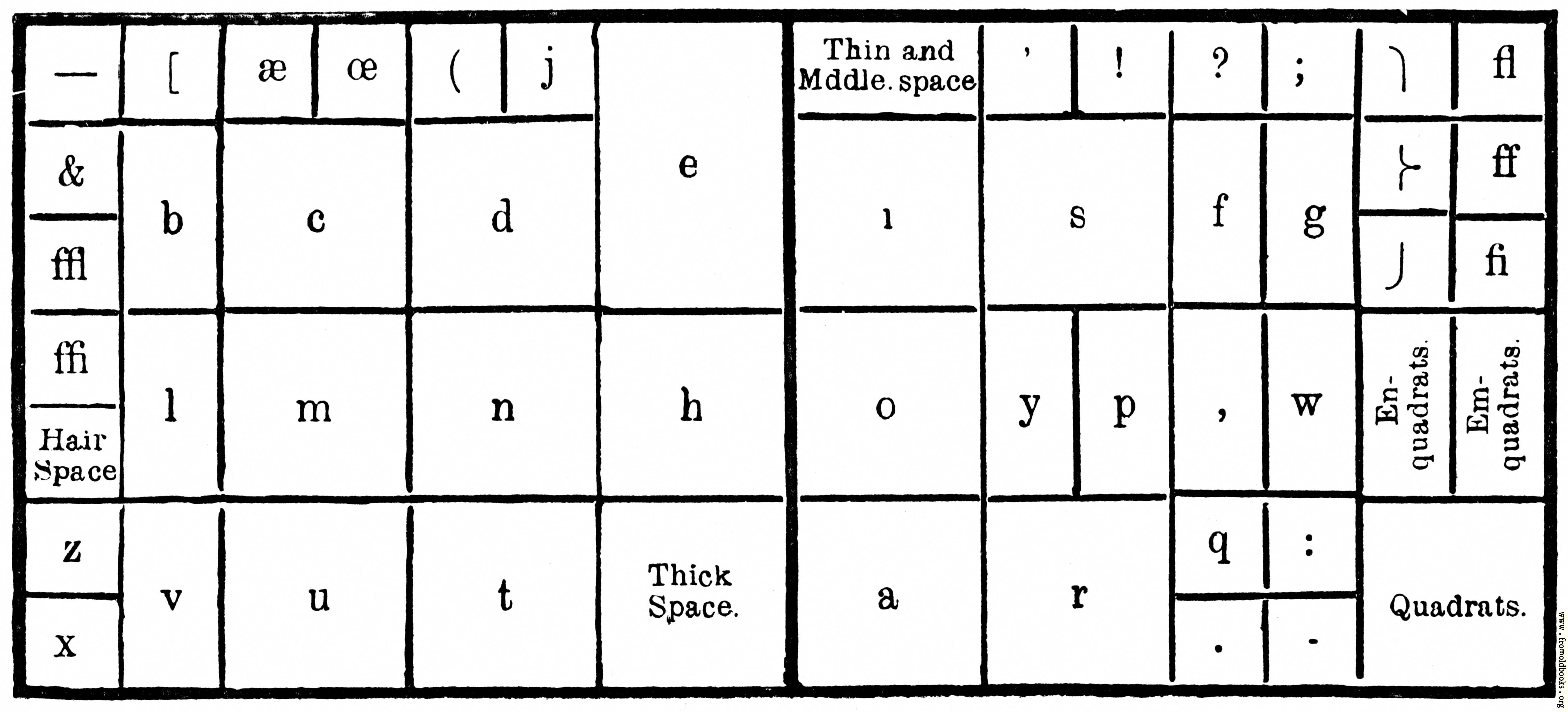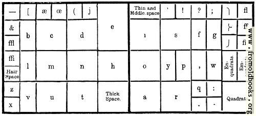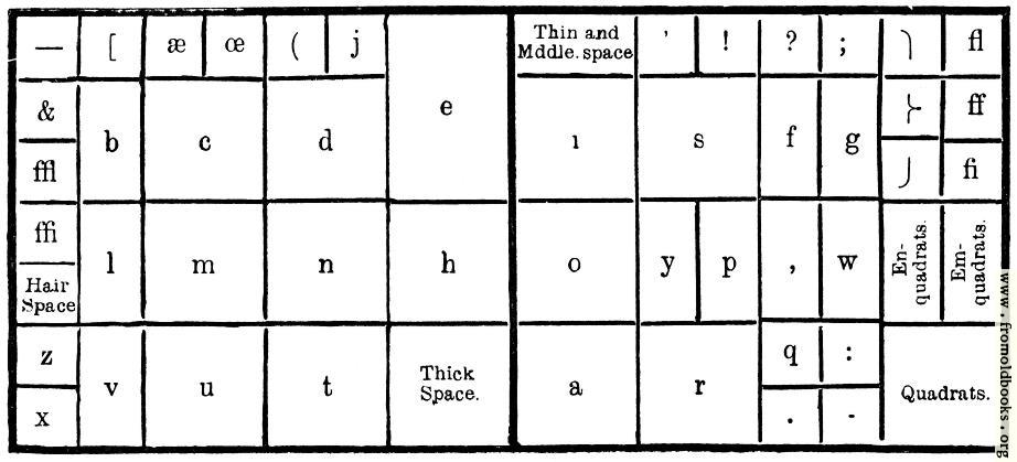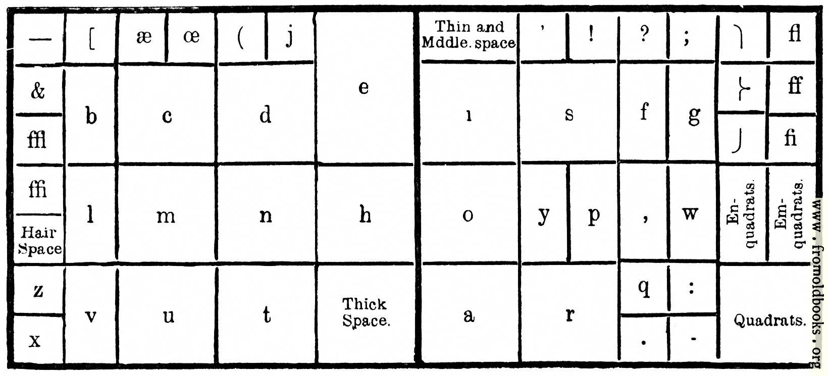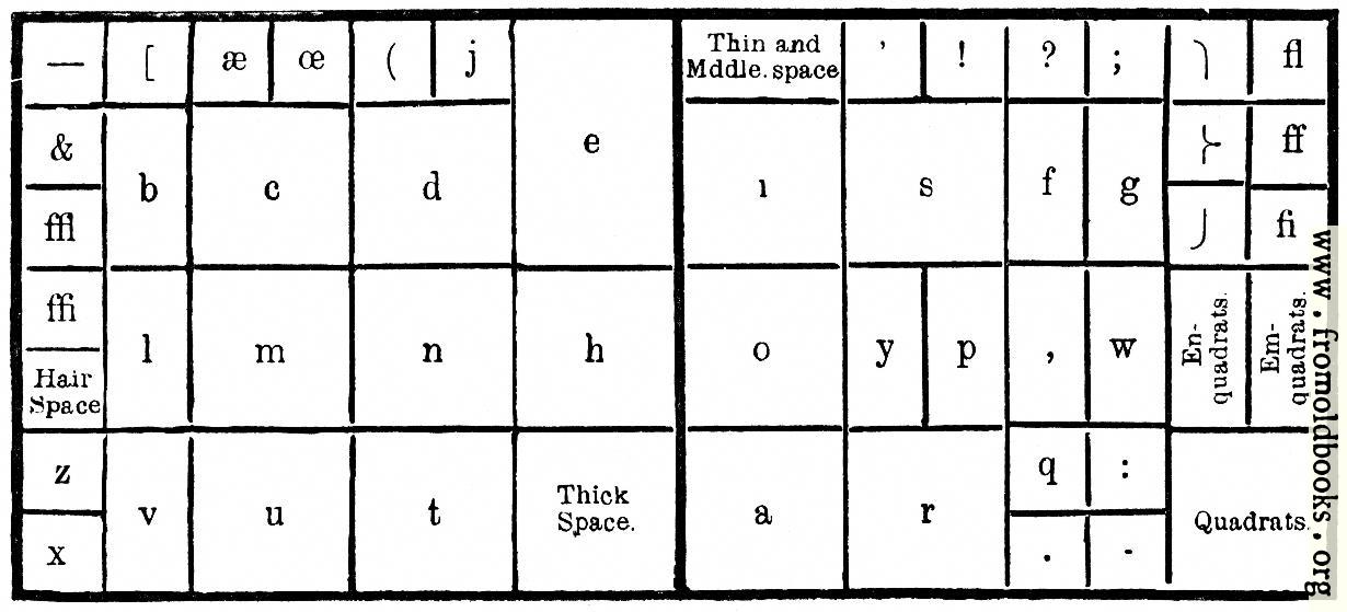[Picture: The “lay” of a pair of type cases (lower case).]